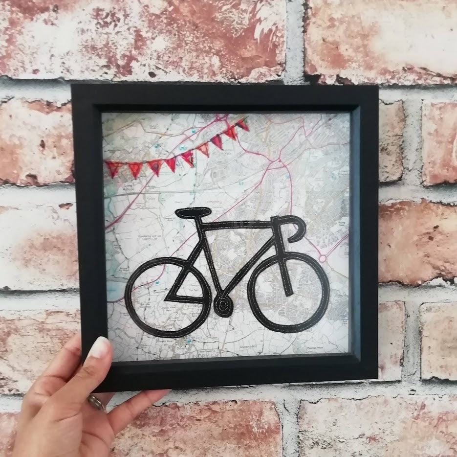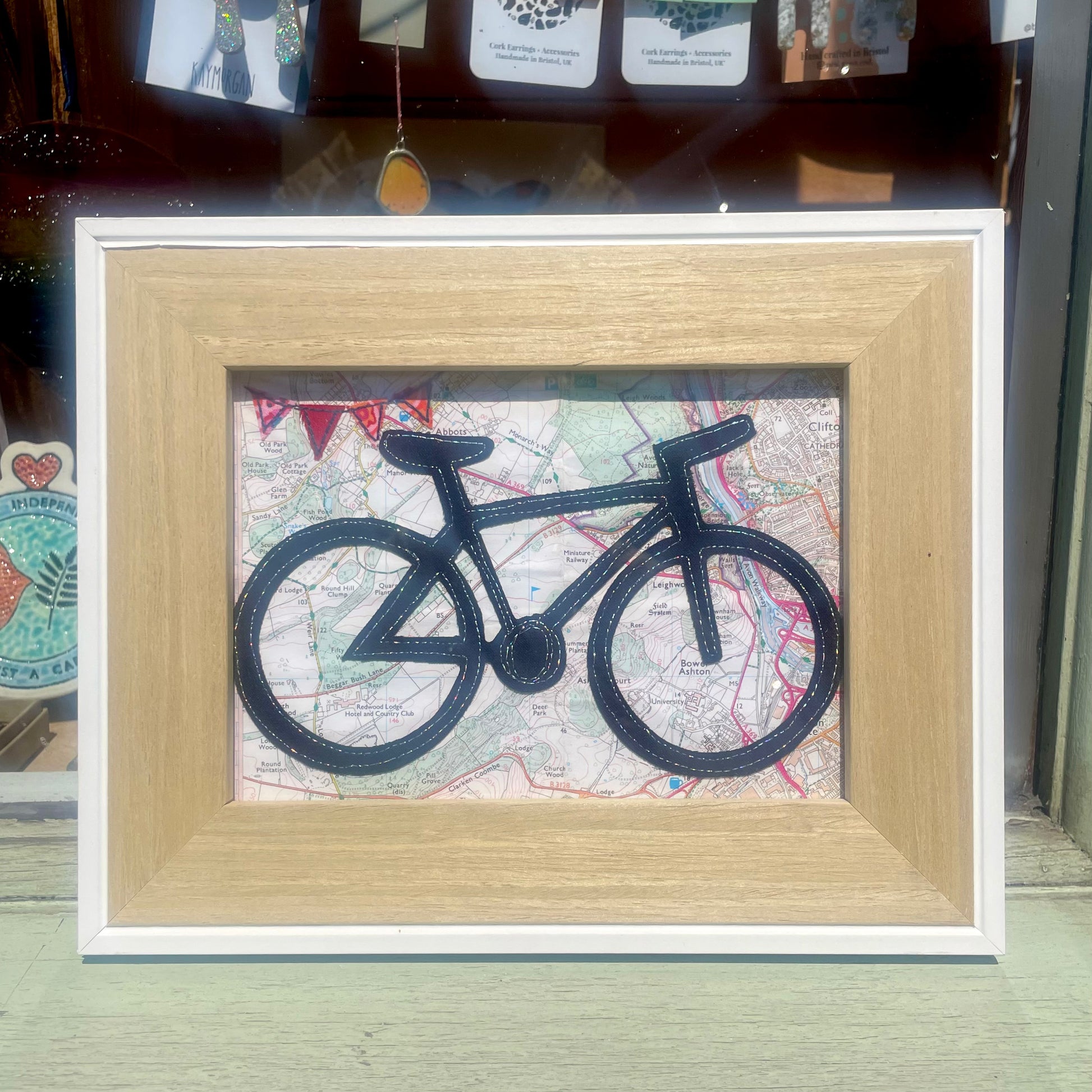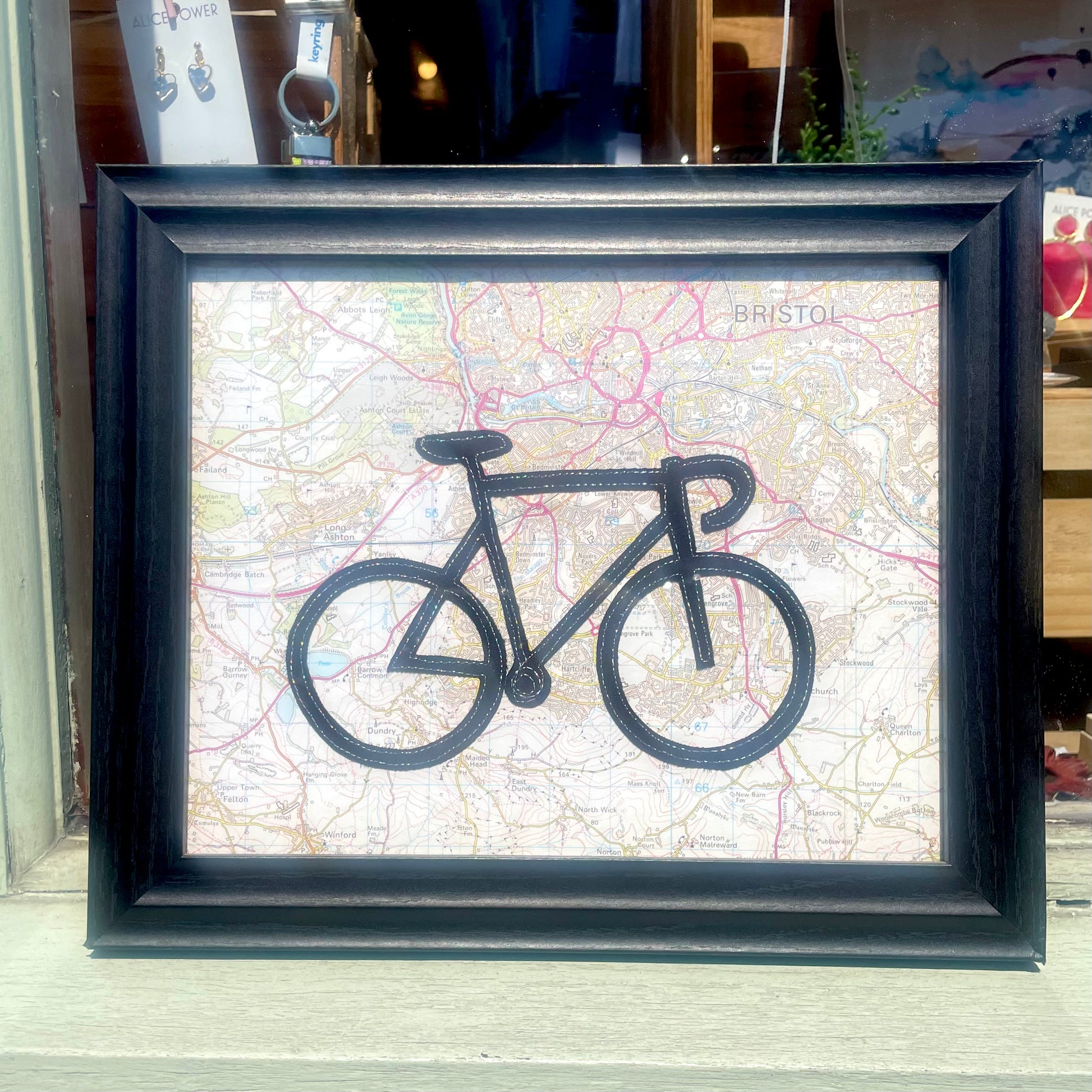 This stylish Bike Picture features a black bike stitched onto a map of Bristol, with added bunting for a special touch.
