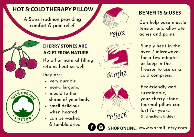 Being made with hundreds of small cherry stones, the pillows adapt to the shape of the body and can provide instant relief, relax the muscles and give you comfort. They also smell delicious when heated!
