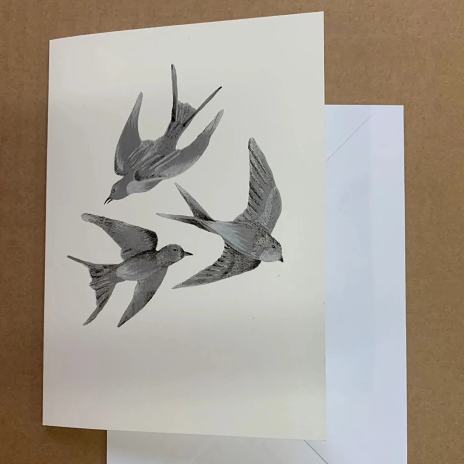Swallows card from Quantum's hand-painted original illustrations, 10.5cm by 14.8cm.