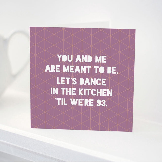 Fun-loving card for your kitchen dancing partner. You and me are meant to be, let's dance in the kitchen til we're 93.