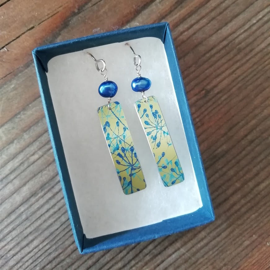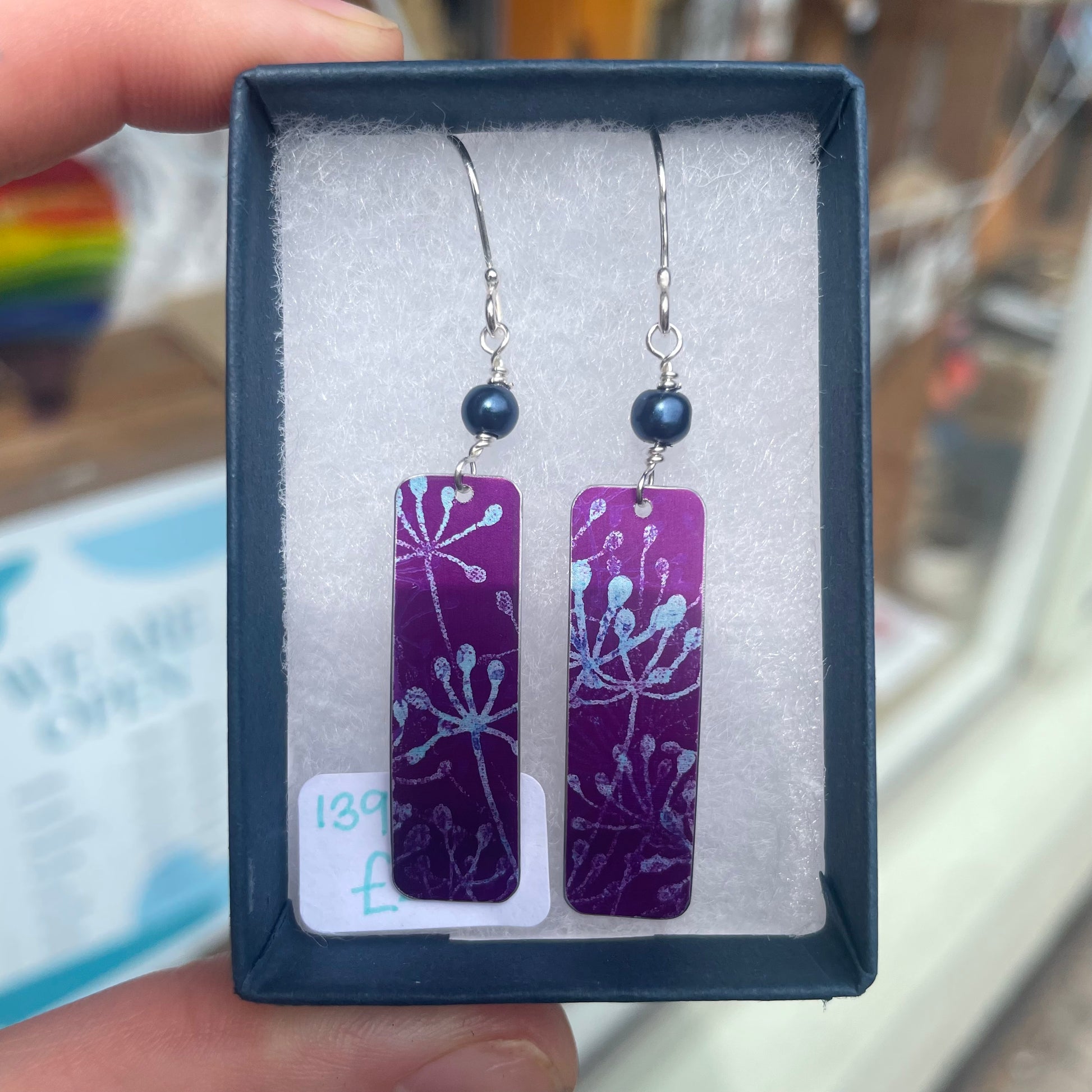These lightweight rectangular anodised aluminium earrings have been printed with a cow parsley pattern in a variety of colours. They are hung from Stirling silver hooks with a blue bead or peacock pearl to finish them off.