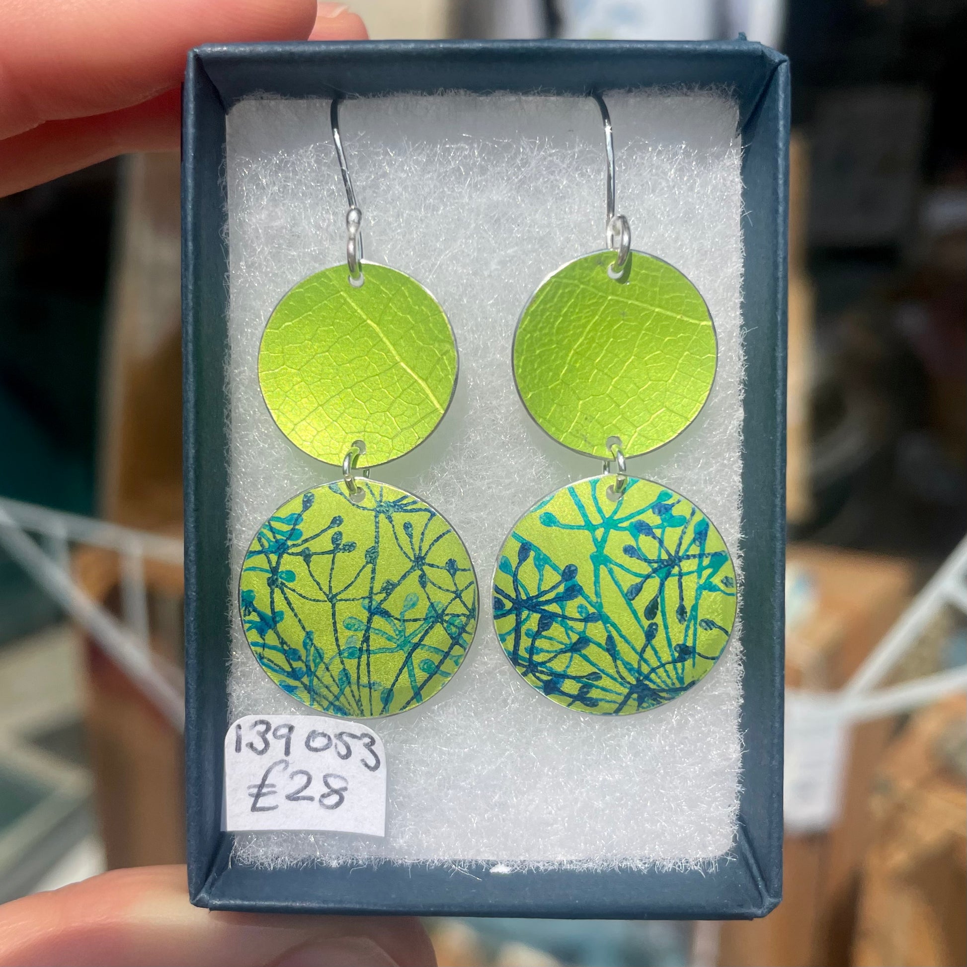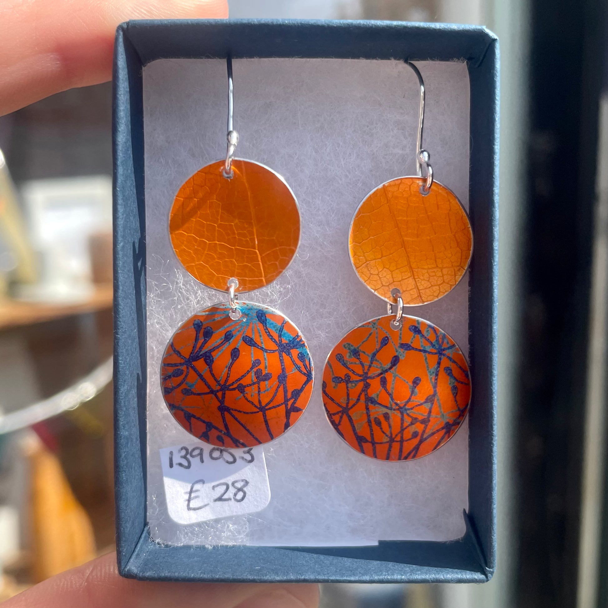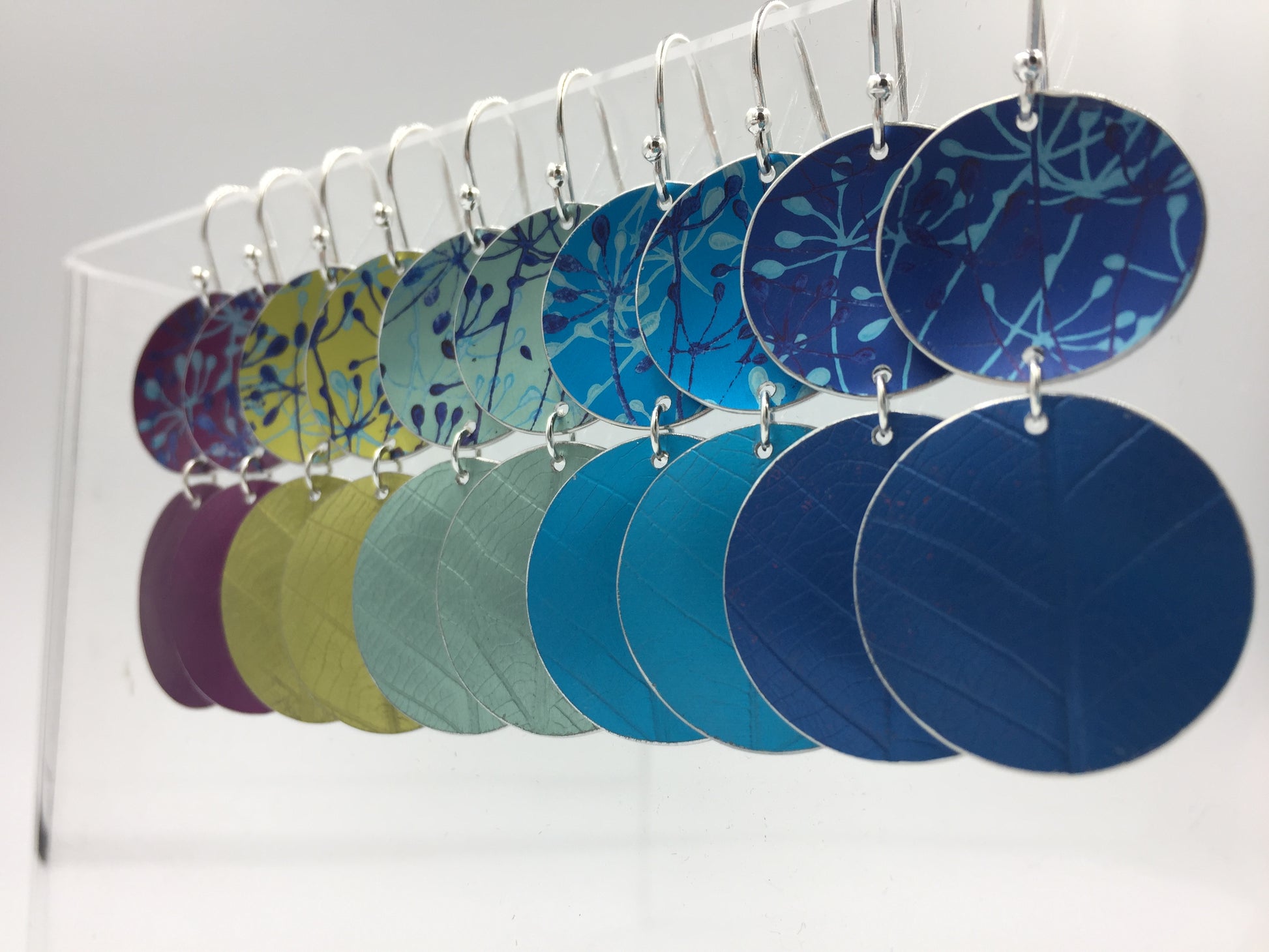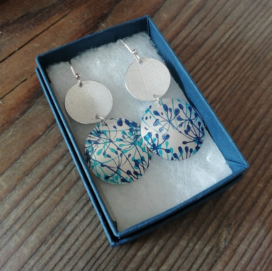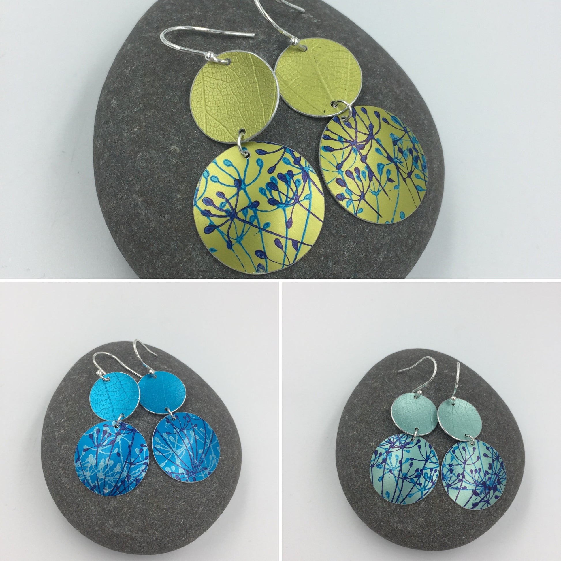 Two circles of textured and dyed aluminium joined with sterling silver jump rings.