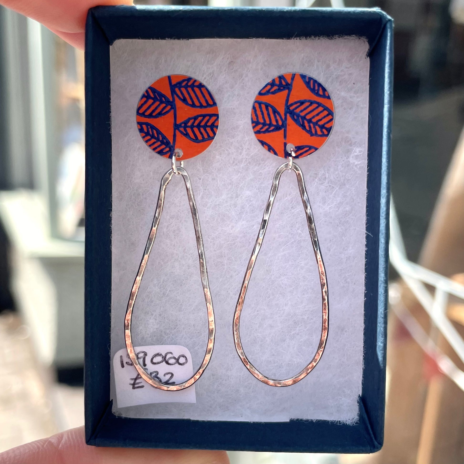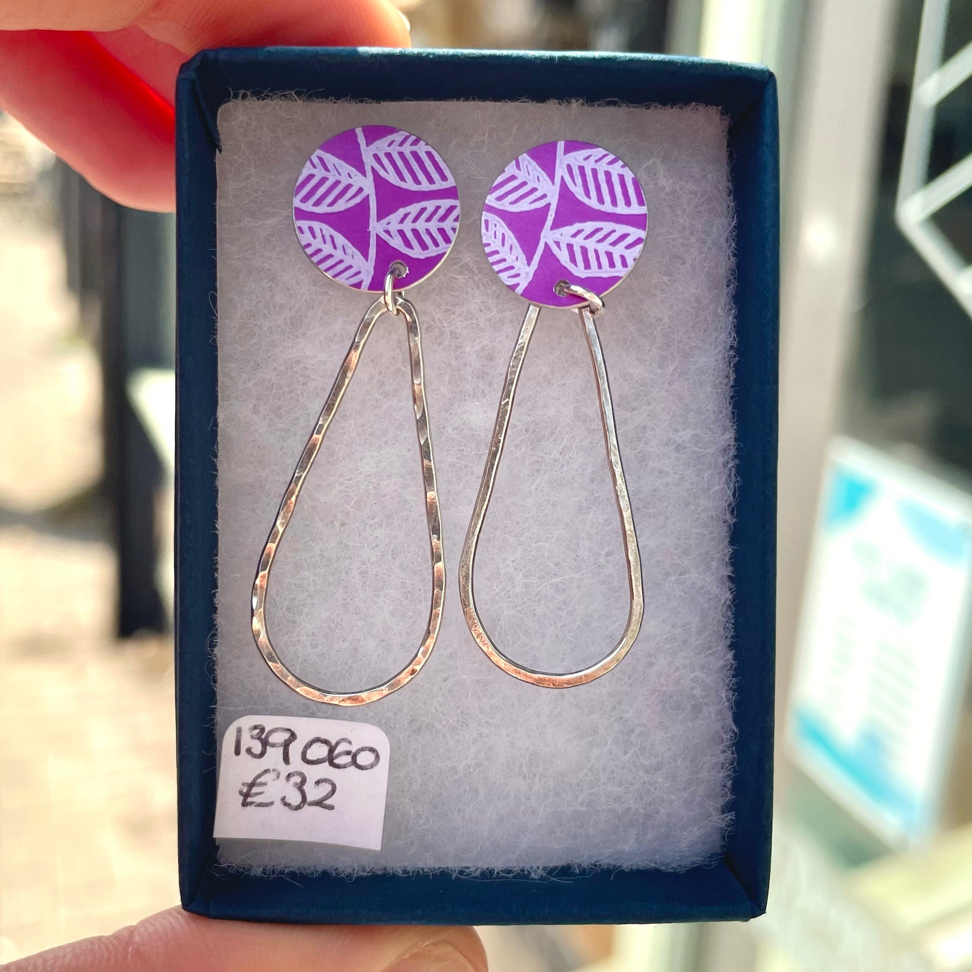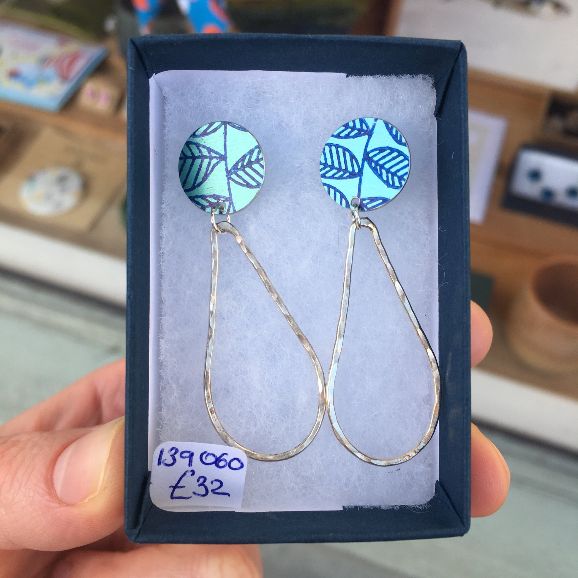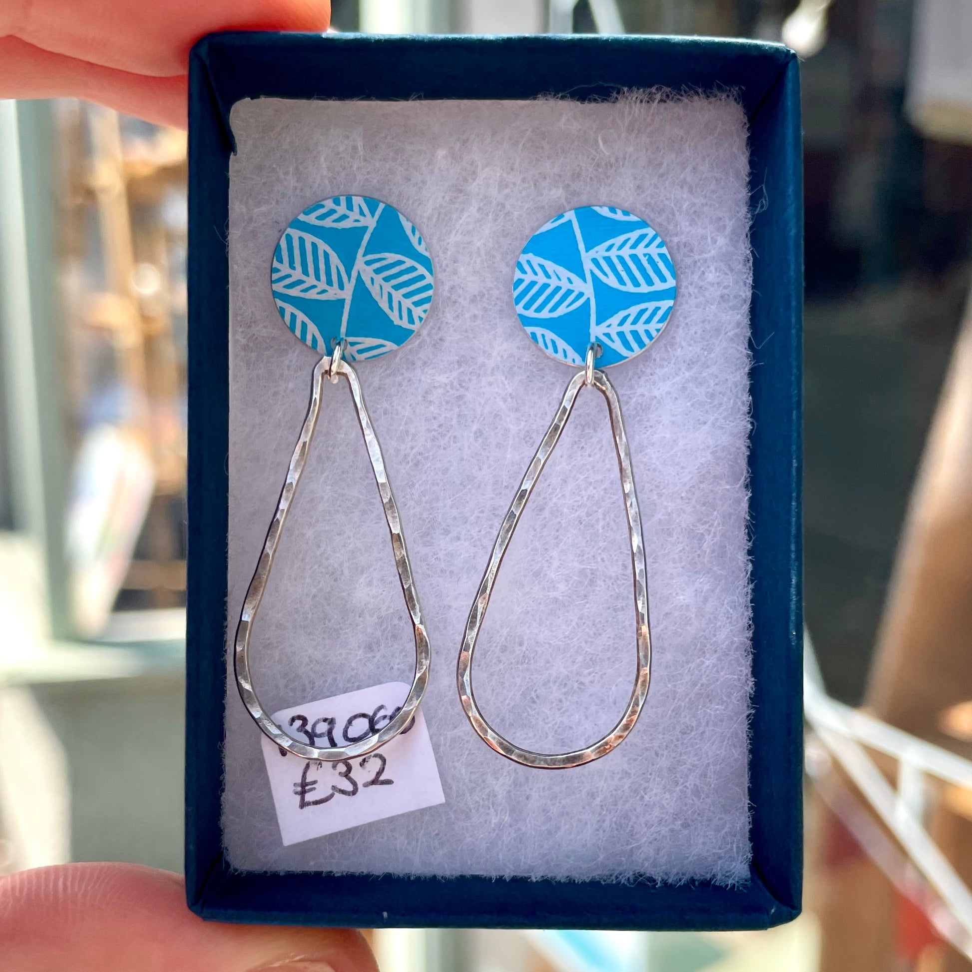 Crafted with leaf printed and dyed aluminium circle studs and handmade silver drops, they are sure to make a statement.