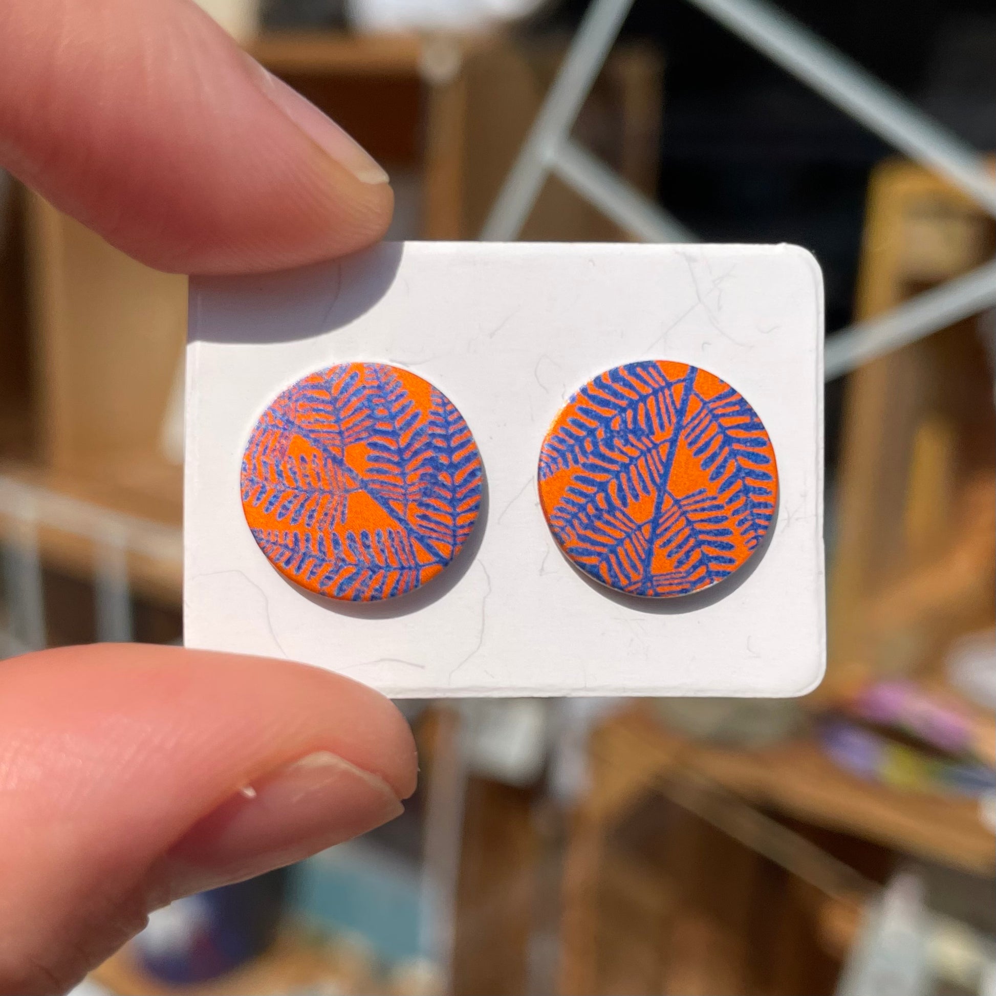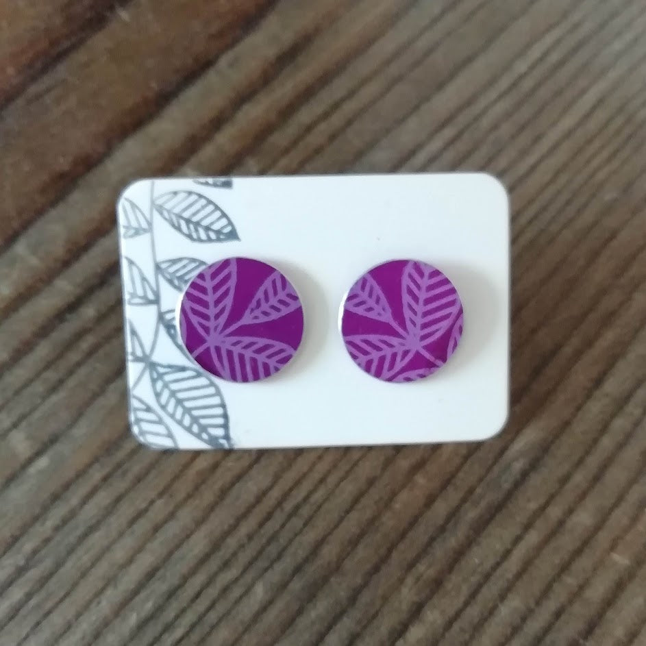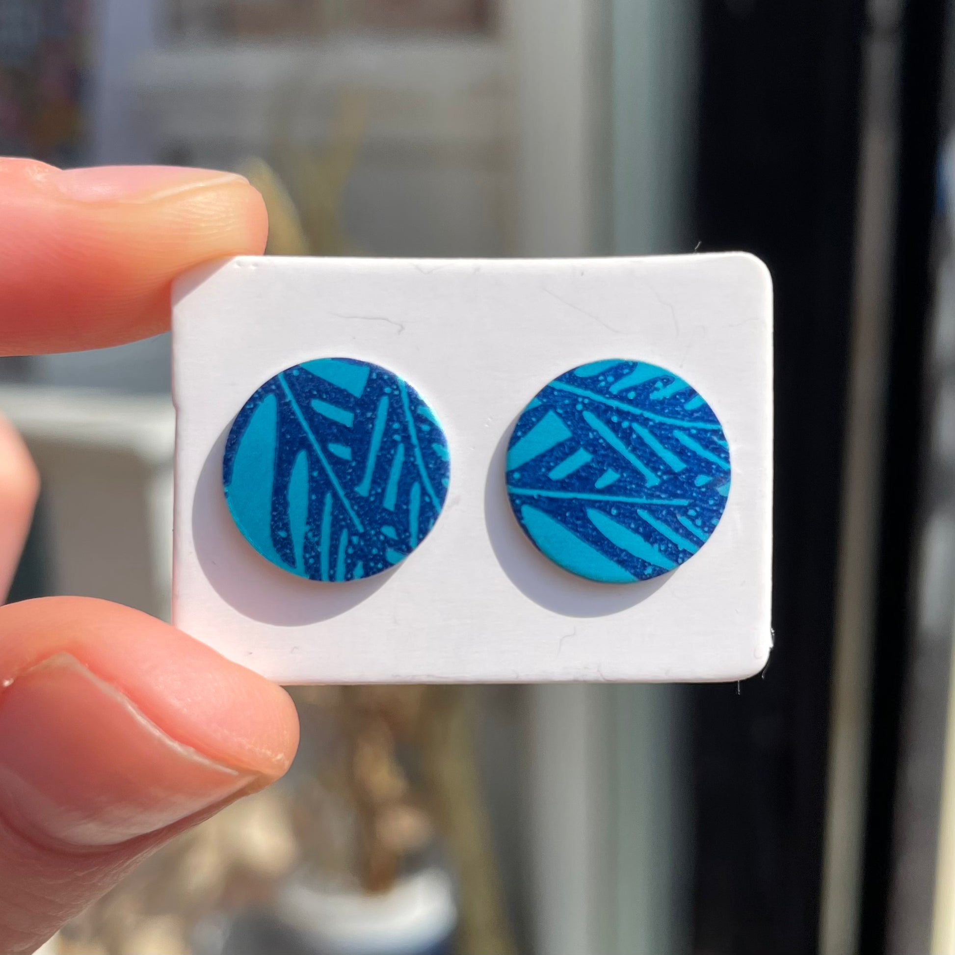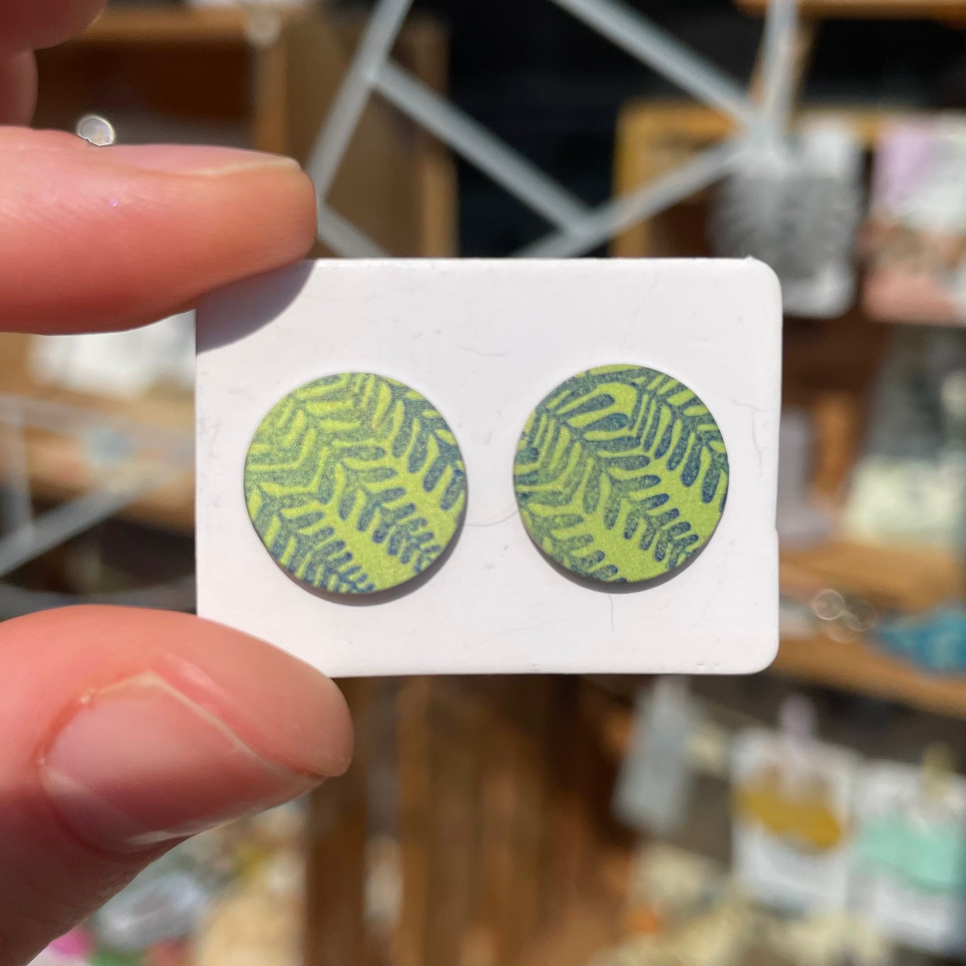These unique stud earrings are crafted with aluminium circles, printed with intricate leaf designs, and dyed for lasting colour. Enjoy lightweight comfort and timeless style with these delightful studs.