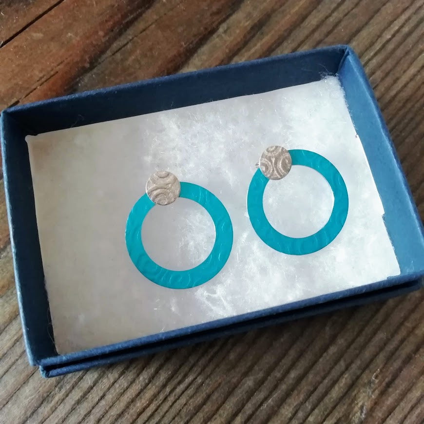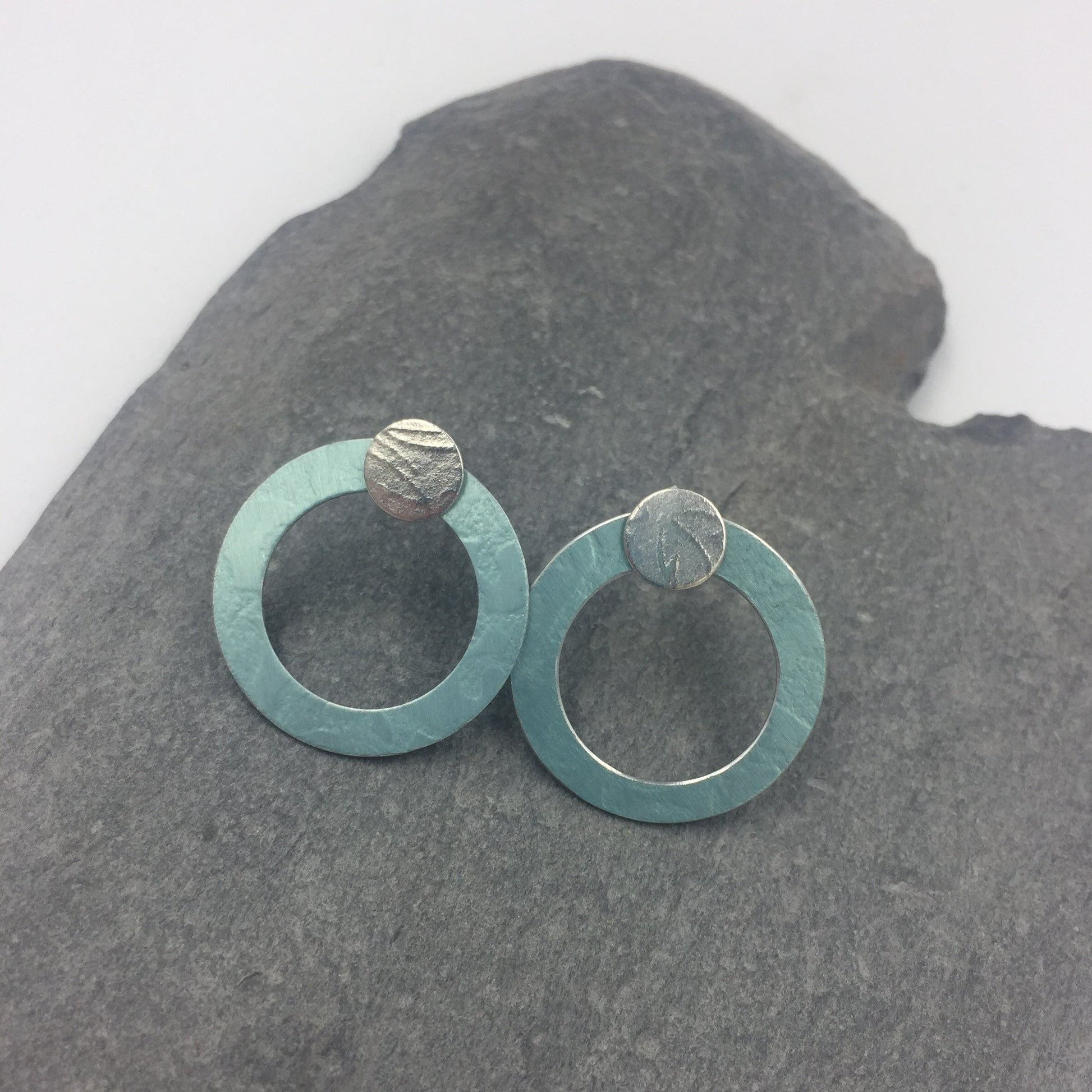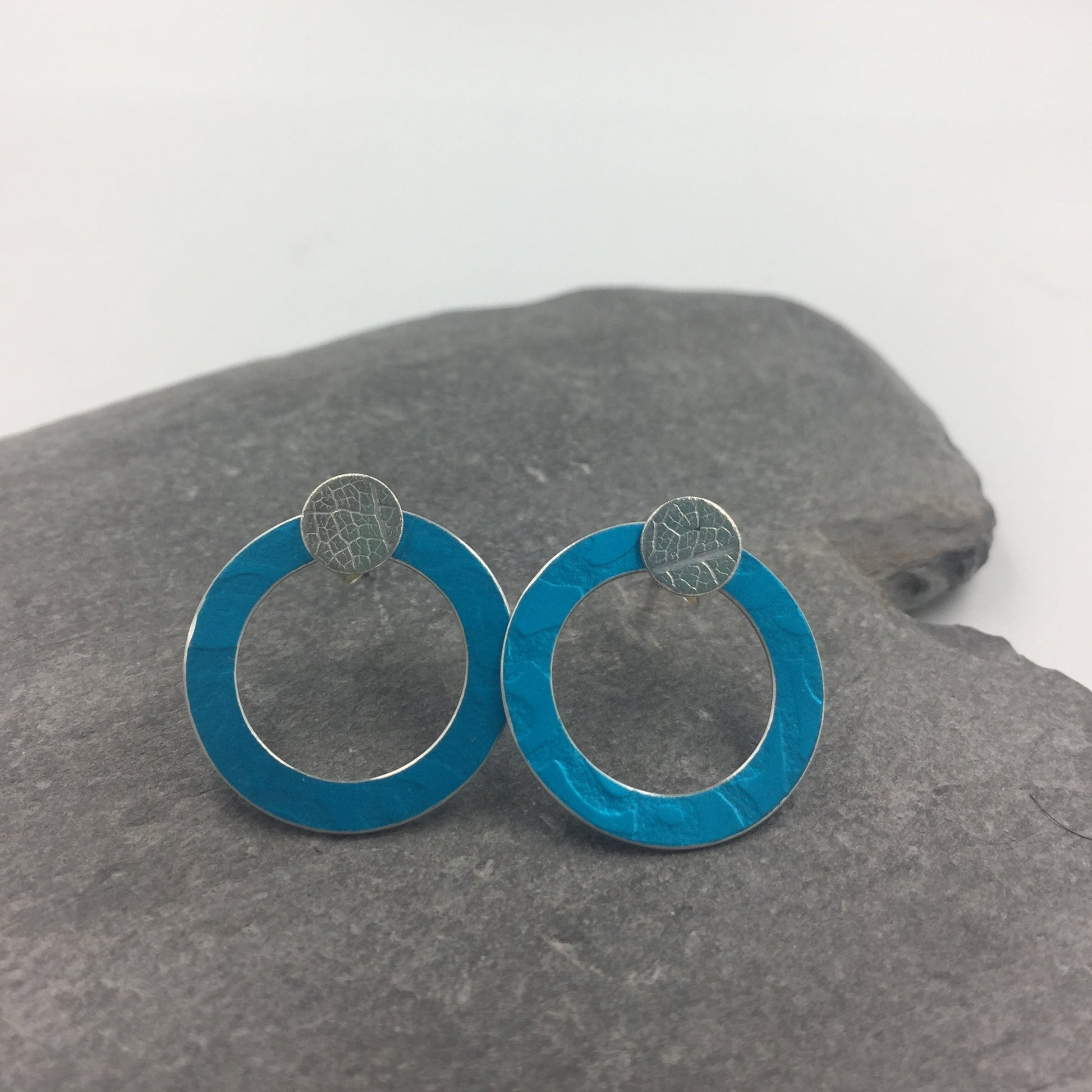 These statement studs are actually 2 pairs in one. The sterling silver stud can be worn alone or with the teal aluminium hoop. Each piece has been textured with a lace or leaf pattern.