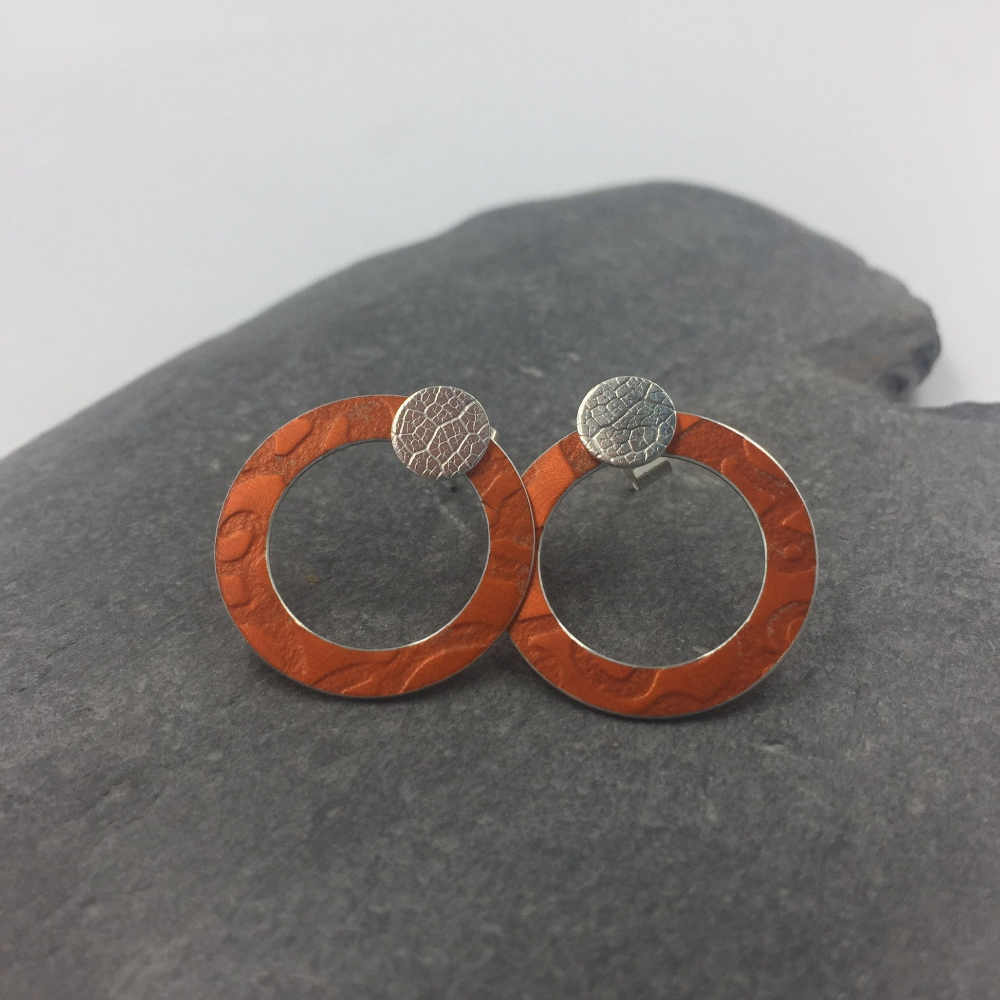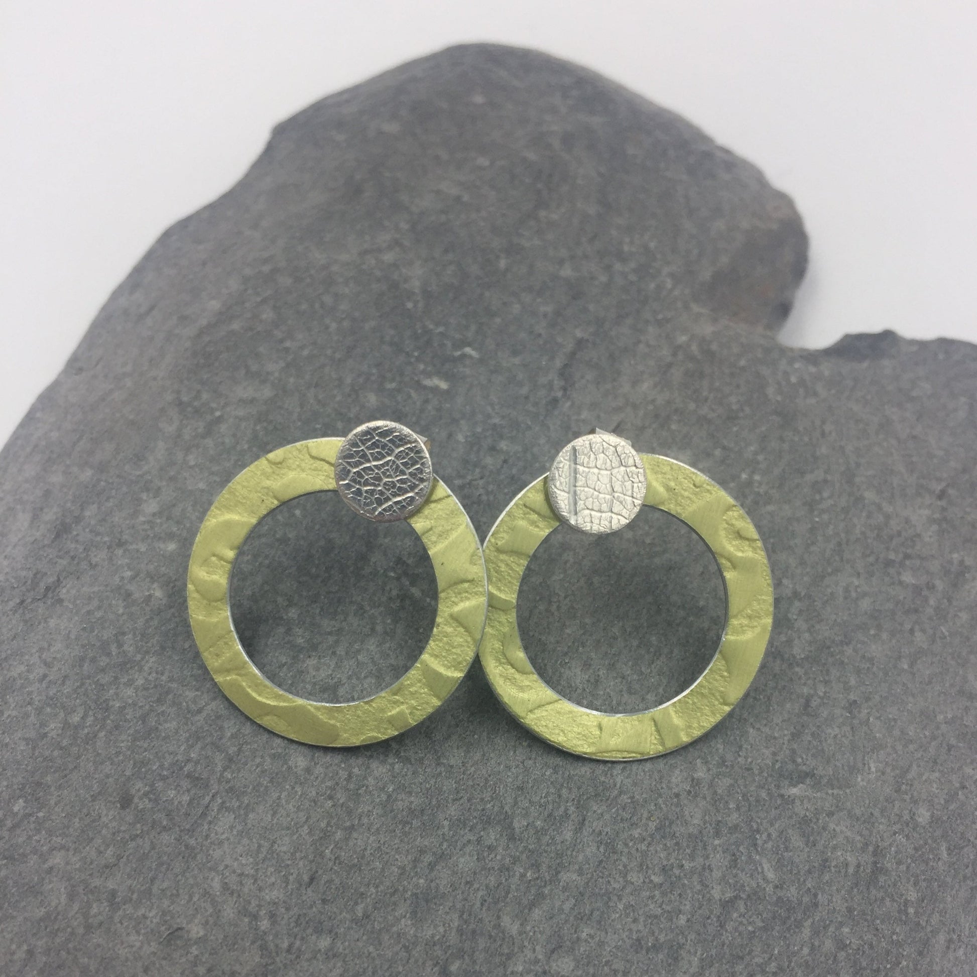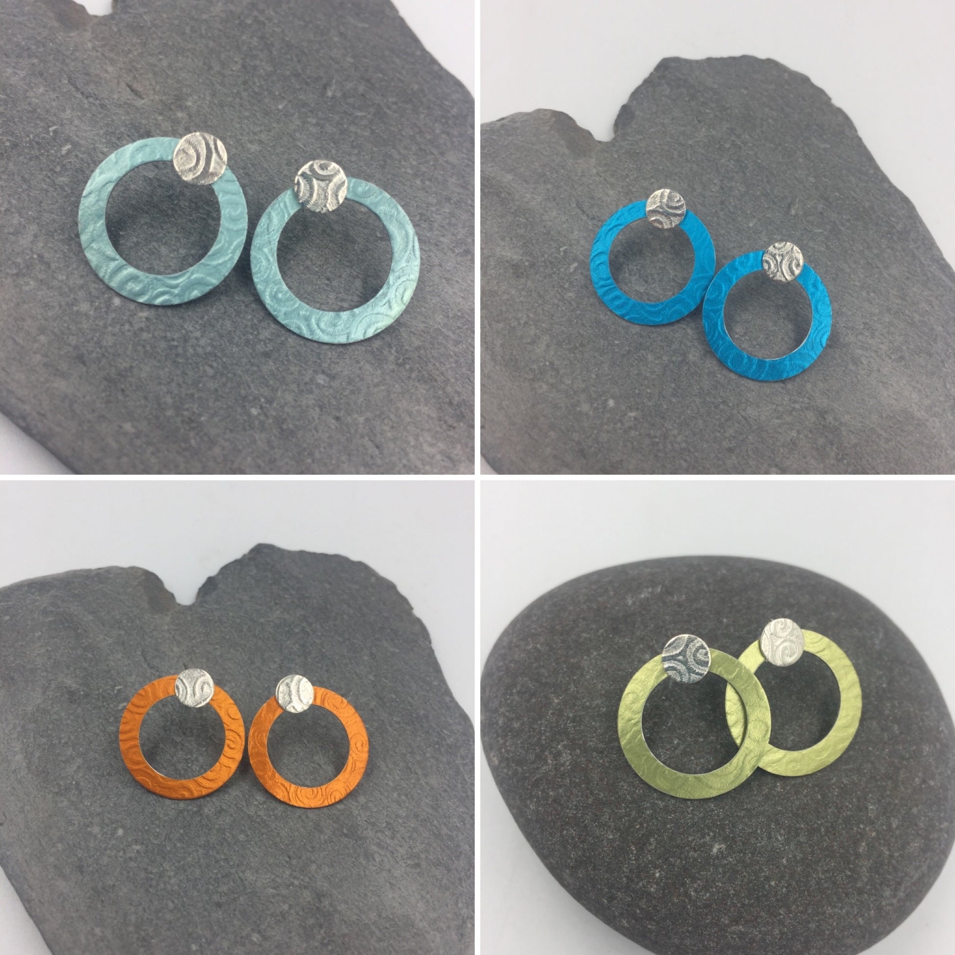 These statement studs are actually 2 pairs in one. The sterling silver stud can be worn alone or with the teal aluminium hoop. Each piece has been textured with a lace or leaf pattern.