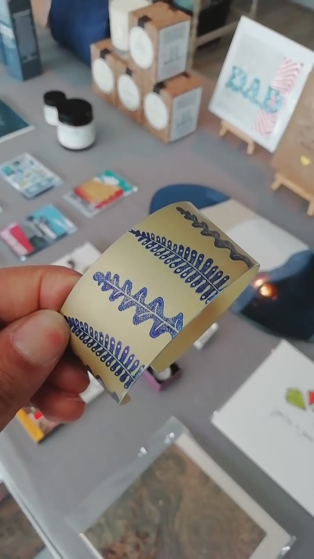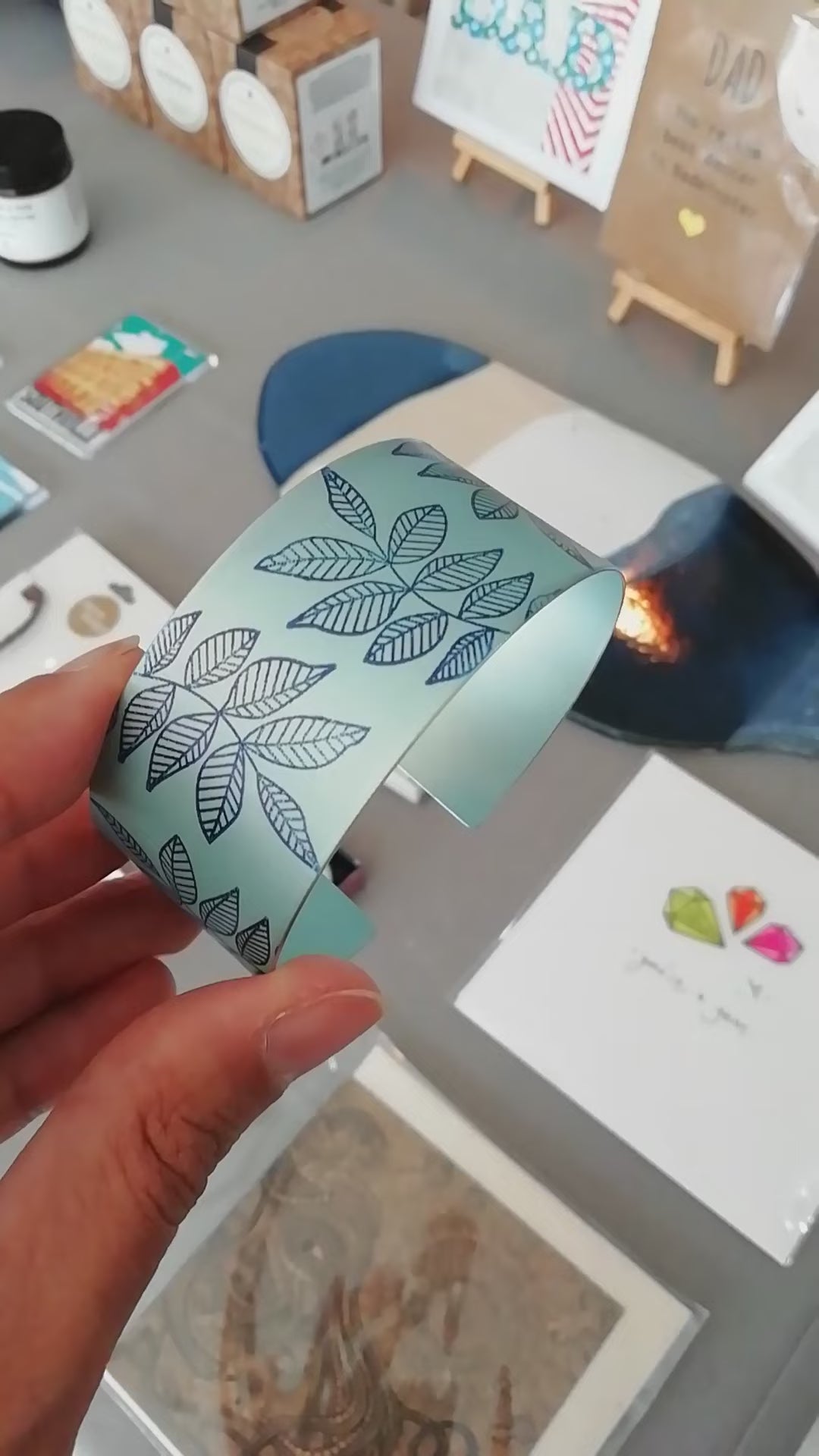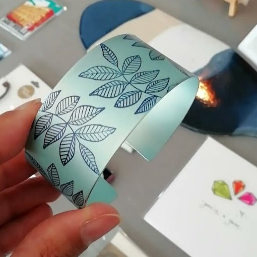 A long length of thin dyed aluminium has been rolled into a circle which can be worn around the wrist. It is very lightweight, so is perfect for a day to night wear.