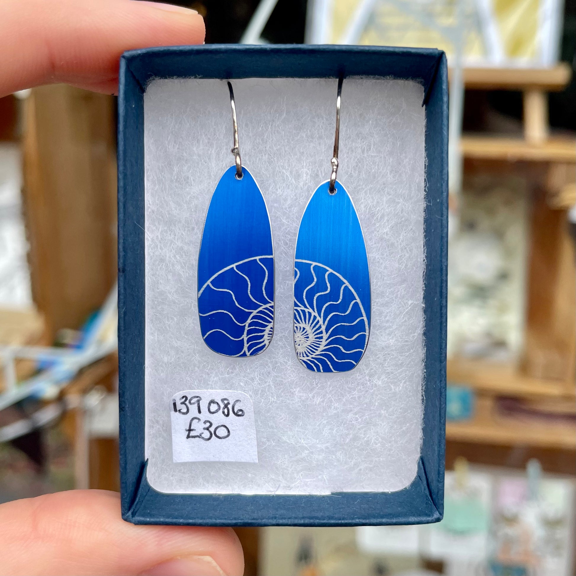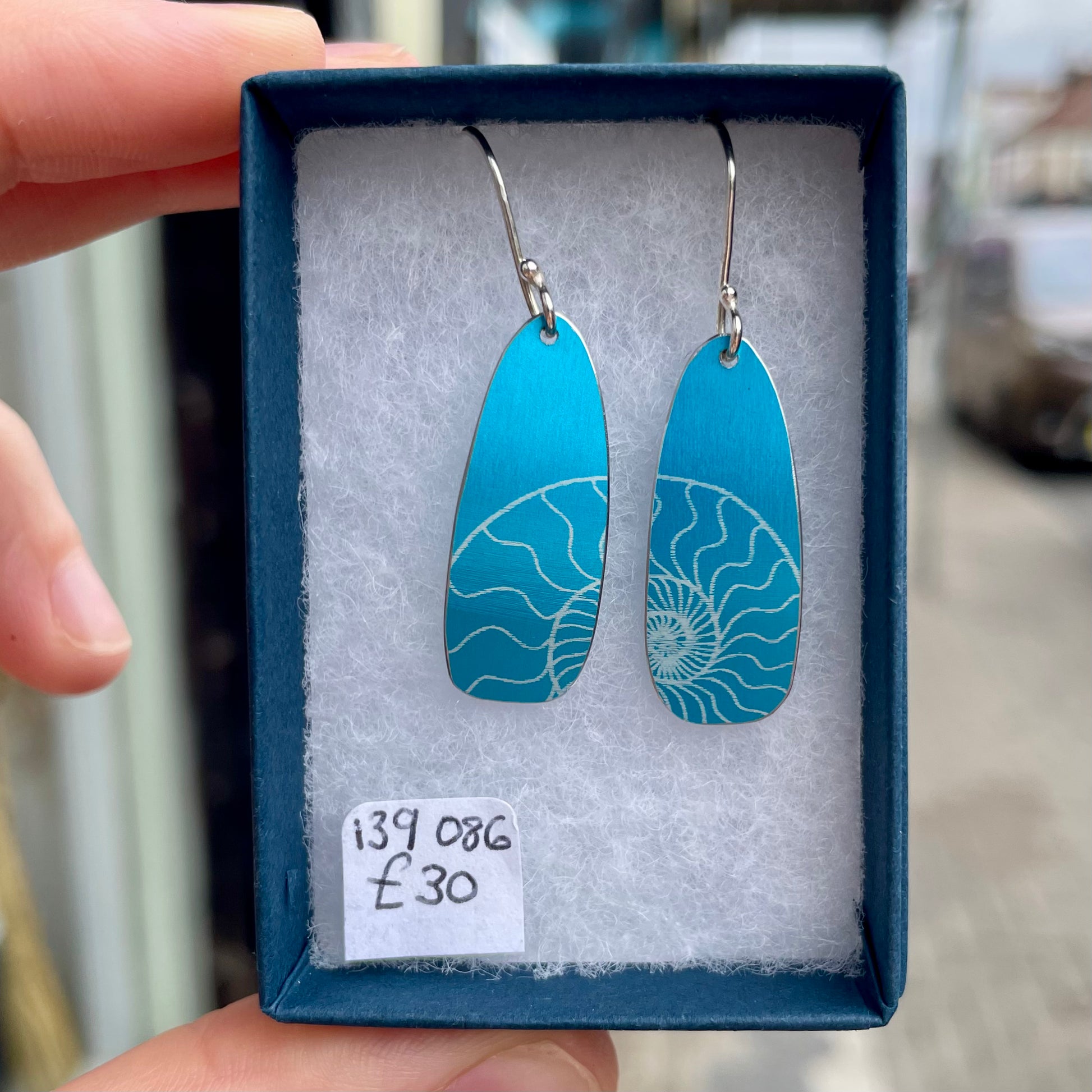 These colourful aluminium ammonite drop earrings are a beautiful blend of nature and craftsmanship. The hand-drawn ammonite design, laser-etched into the surface of the dyed turquoise aluminium, is inspired by the distinctive ammonite pavement found along the Lyme Regis coast.