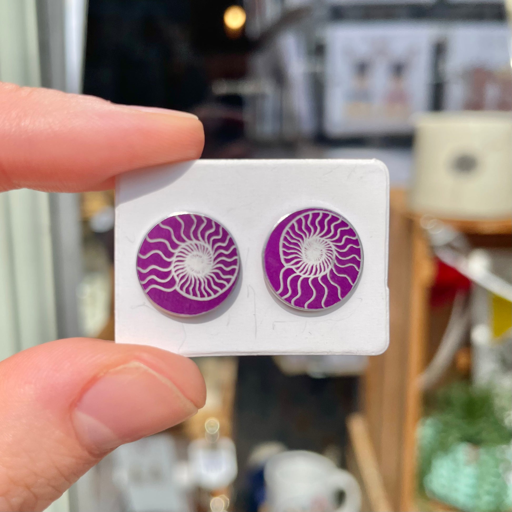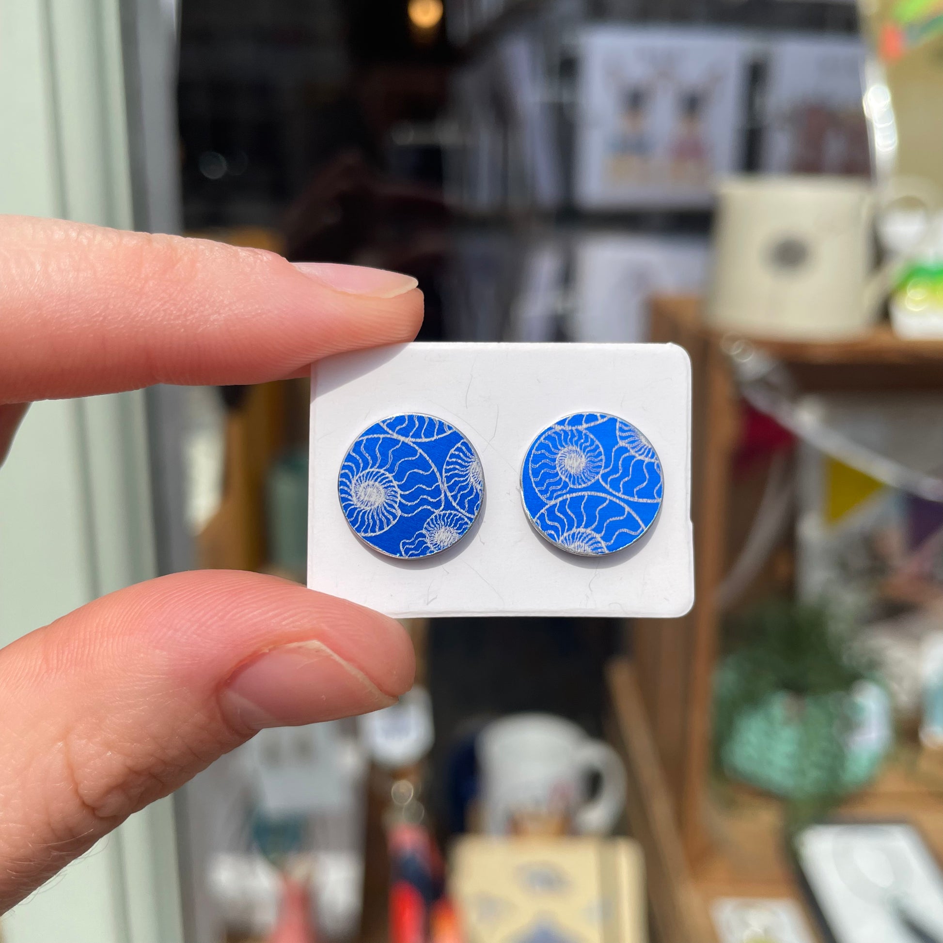 These colourful aluminium ammonite stud earrings feature a stunning hand drawn design, laser etched into dyed turquoise aluminium. The intricate ammonite pattern draws inspiration from the famous ammonite pavement along the Lyme Regis coast, making them a unique and meaningful piece of jewellery.