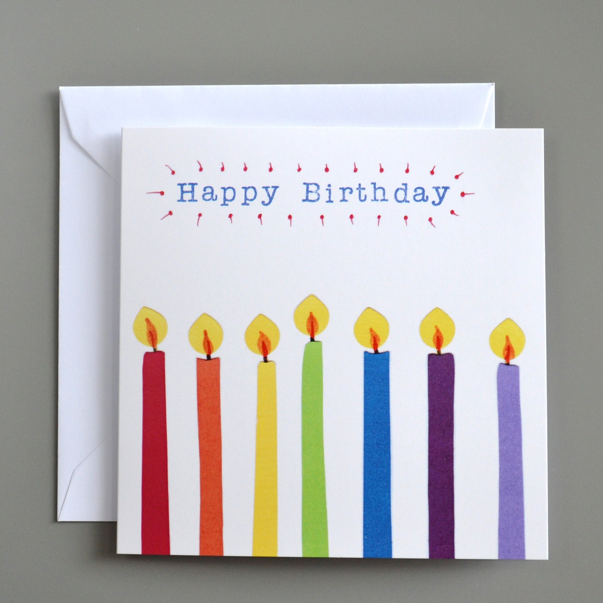 This birthday card shows a row of seven lit candles, one in each colour of the rainbow. Text says 'Happy Birthday!' in blue.