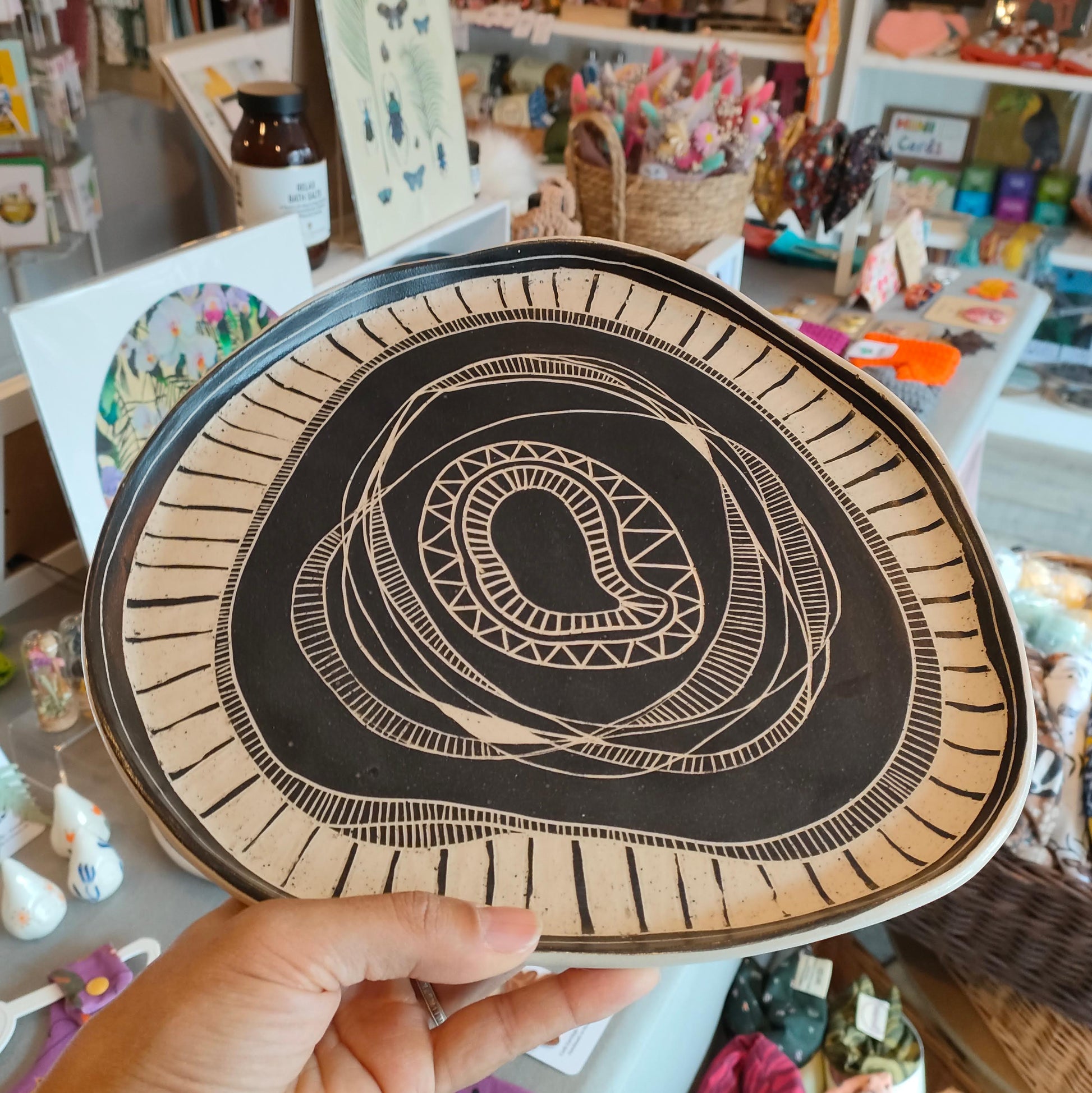 Elevate your dining experience with this hand-built ceramic large plate, featuring a striking black and white circle design.
