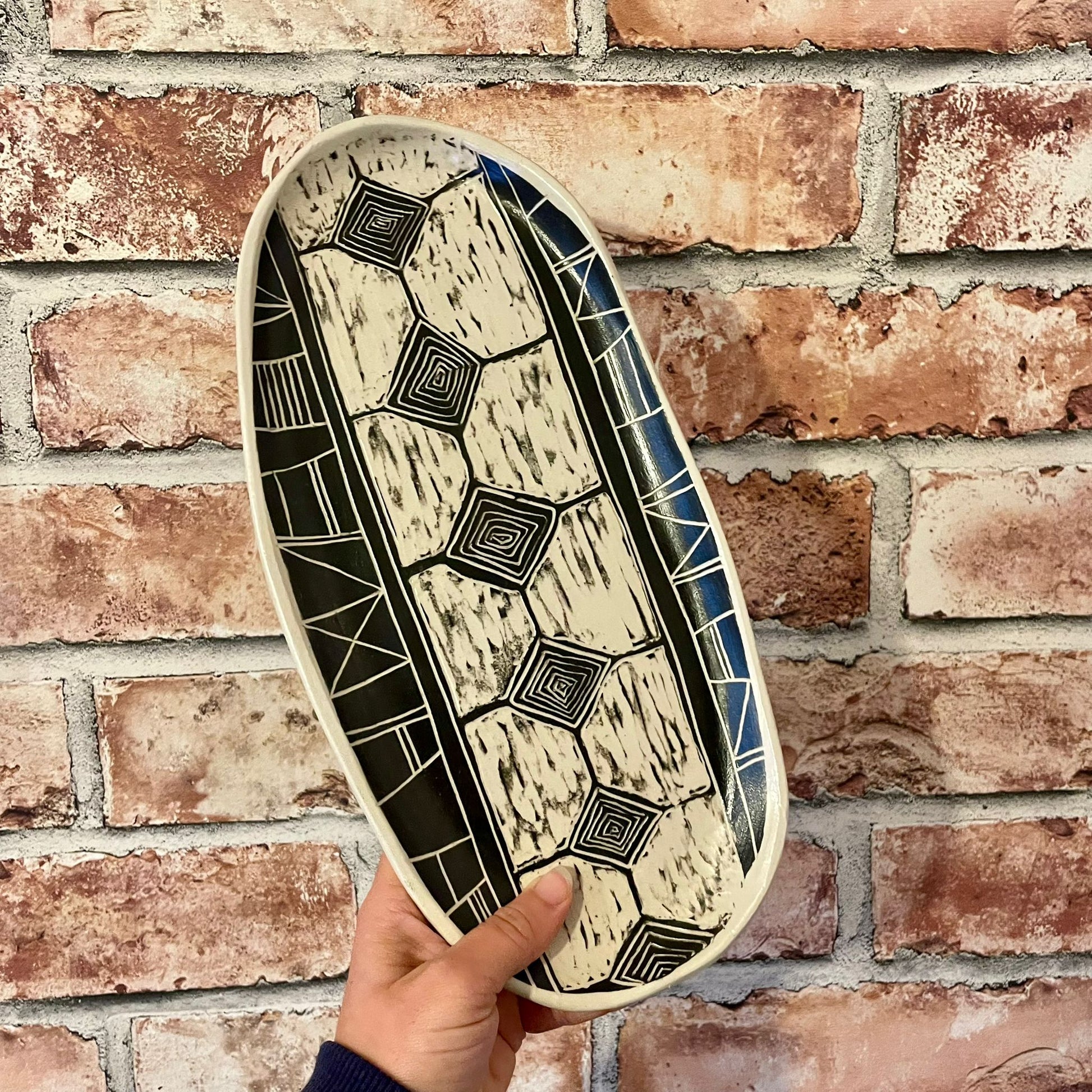Elevate your dining experience with this black & white serving platter, meticulously hand-built and adorned with intricate hand-scribed designs.