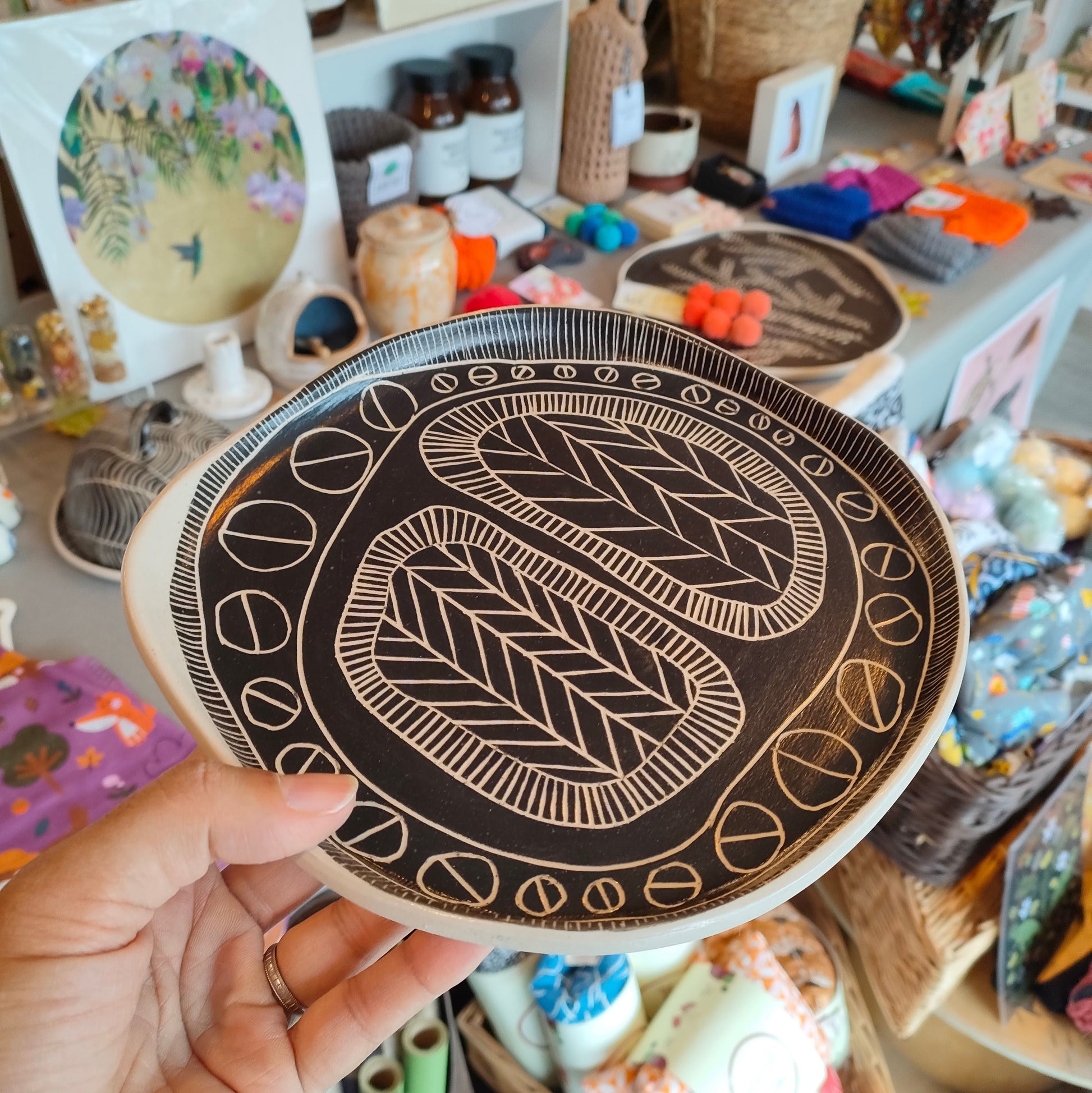 These charming small plates feature a playful black and white geometric design, expertly hand-scribed for a unique touch.