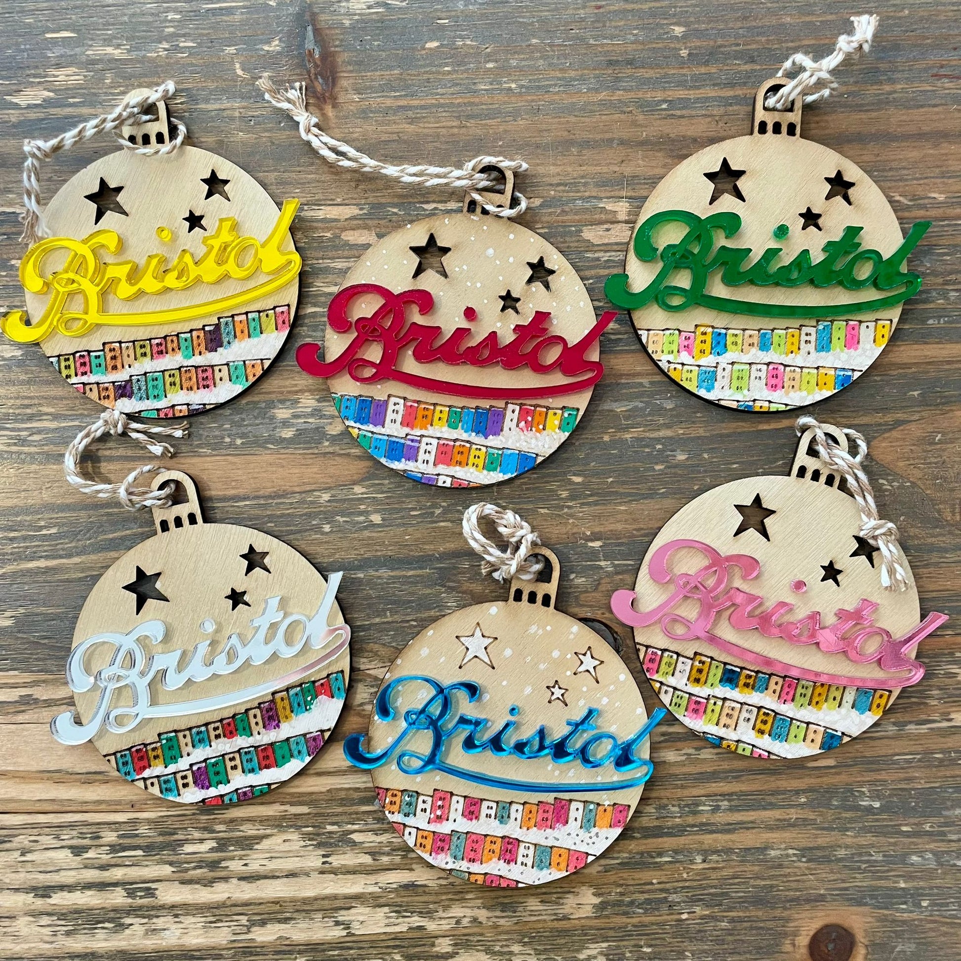 Bristol bauble made from 3mm FSC plywood, the illustrated houses and balloons have been laser cut and etched.