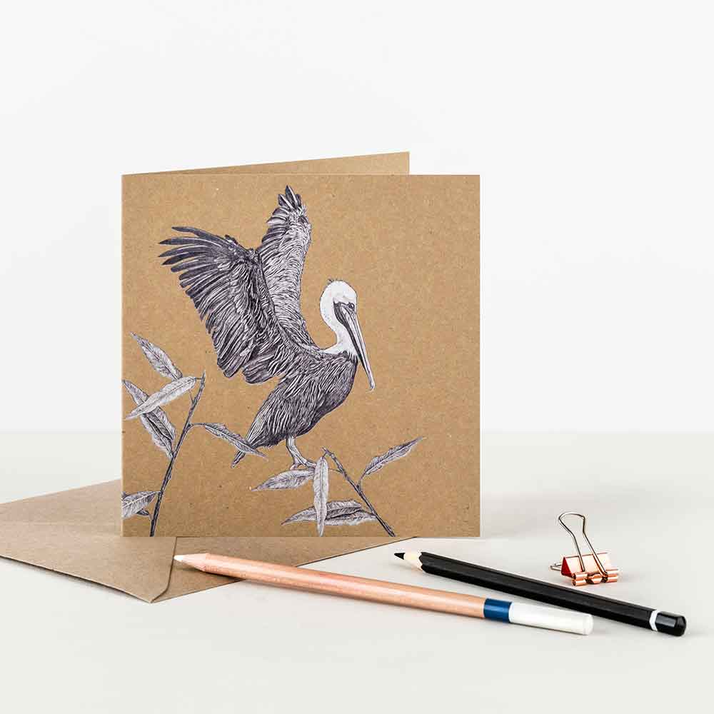 A proud pelican stands with its long wings fanned out whilst perched among tropical mango leaves on this unique recycled greeting card by Sky Siouki. Blank inside for your own message so this gorgeous water bird card is suitable to give to a wildlife lover on any occasion.