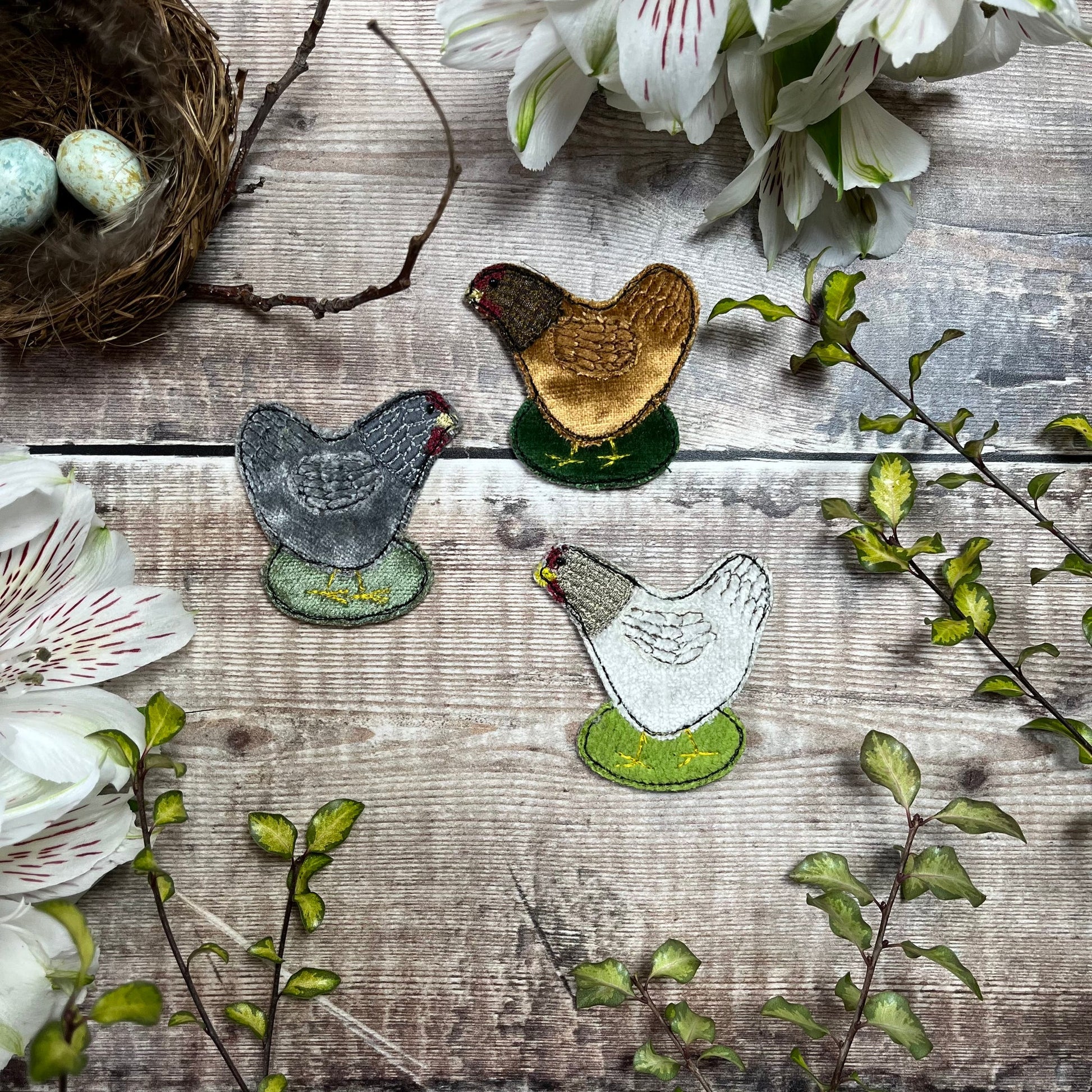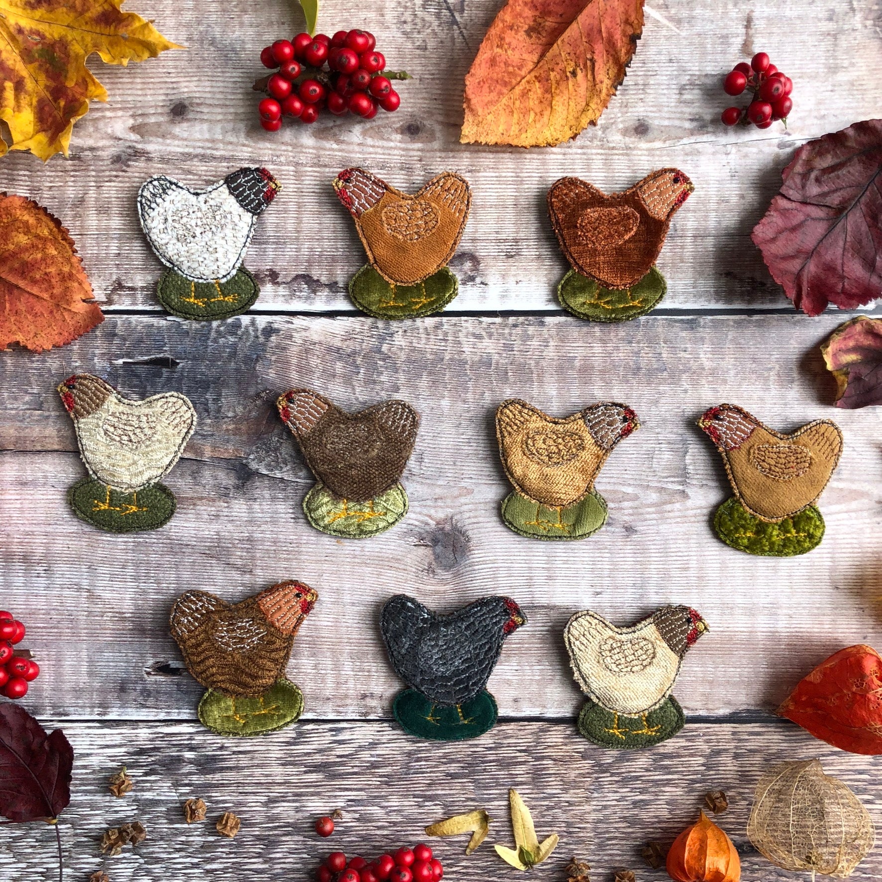 The chickens are decorated with machine embroidery and a glass bead for an eye.
