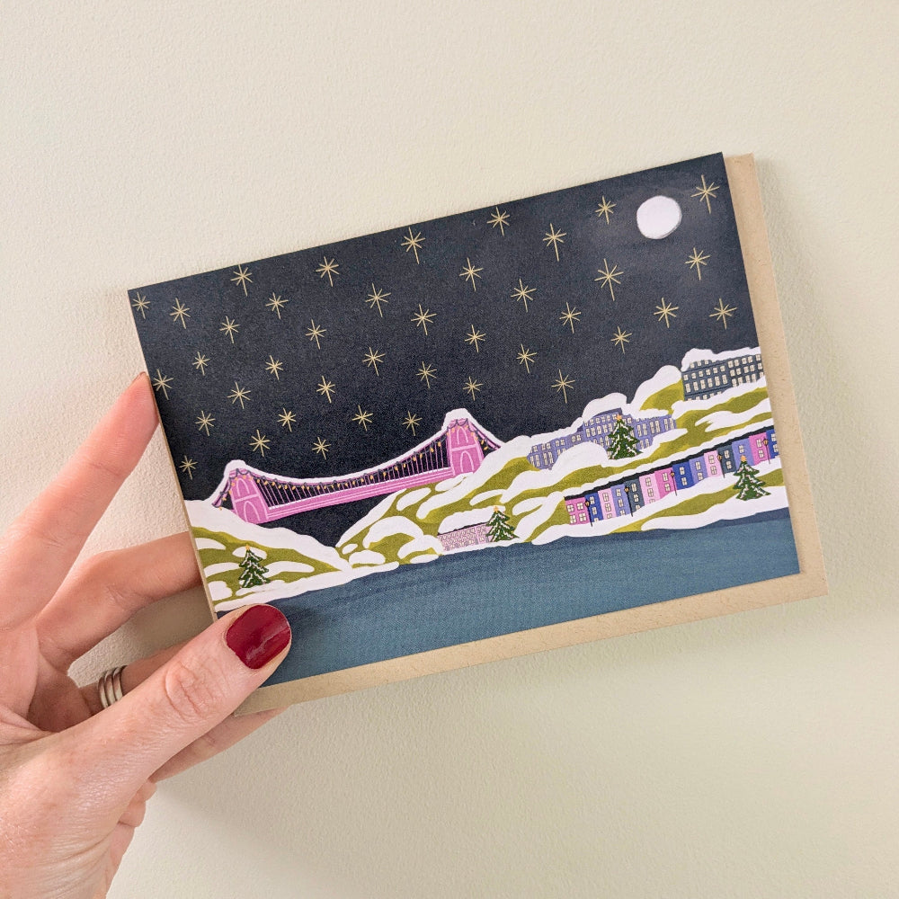 Illustrated Christmas cards featuring a snowy Bristol Clifton Suspension Bridge in the