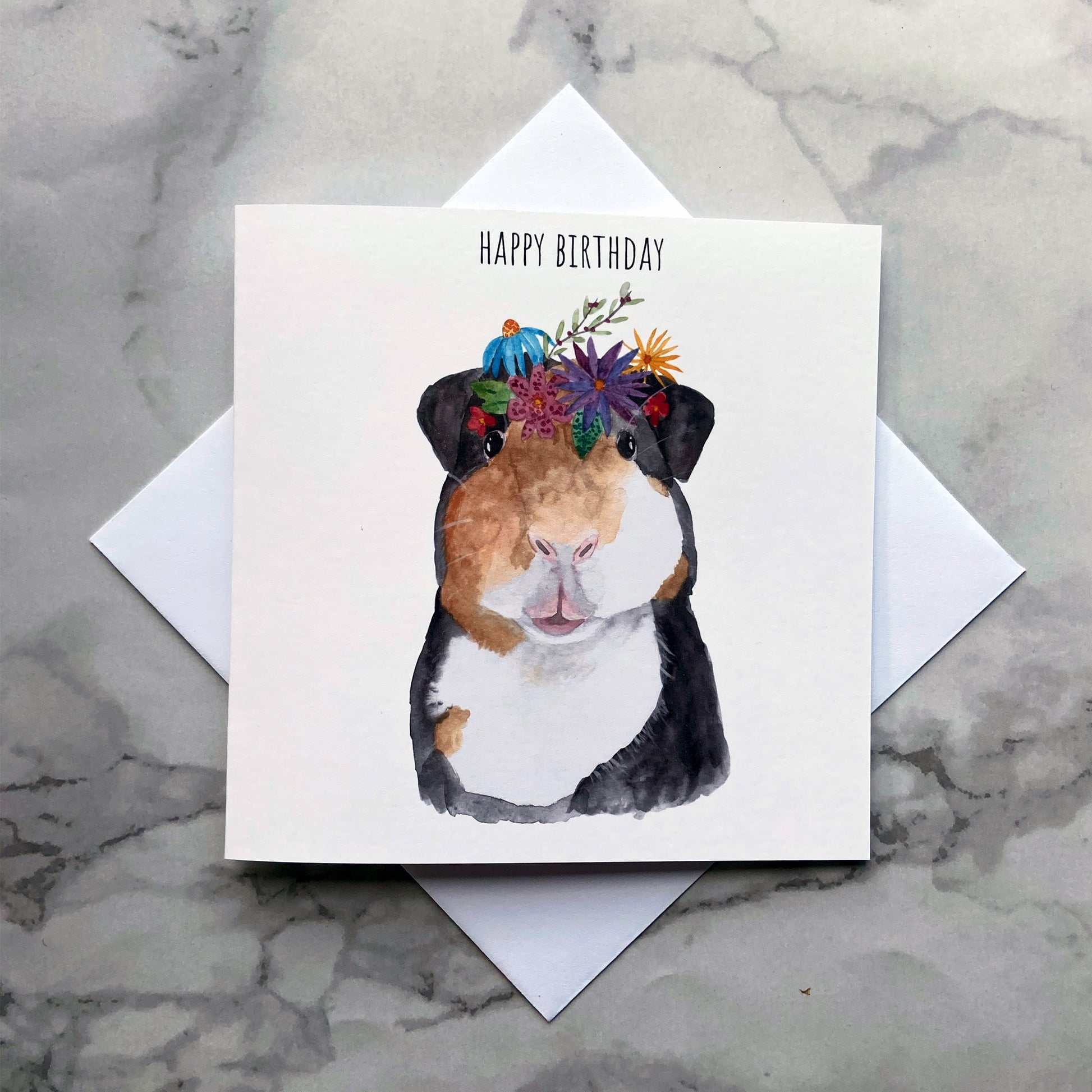 This beautiful Birthday card features a guinea pig wearing a flower crown and is blank inside.