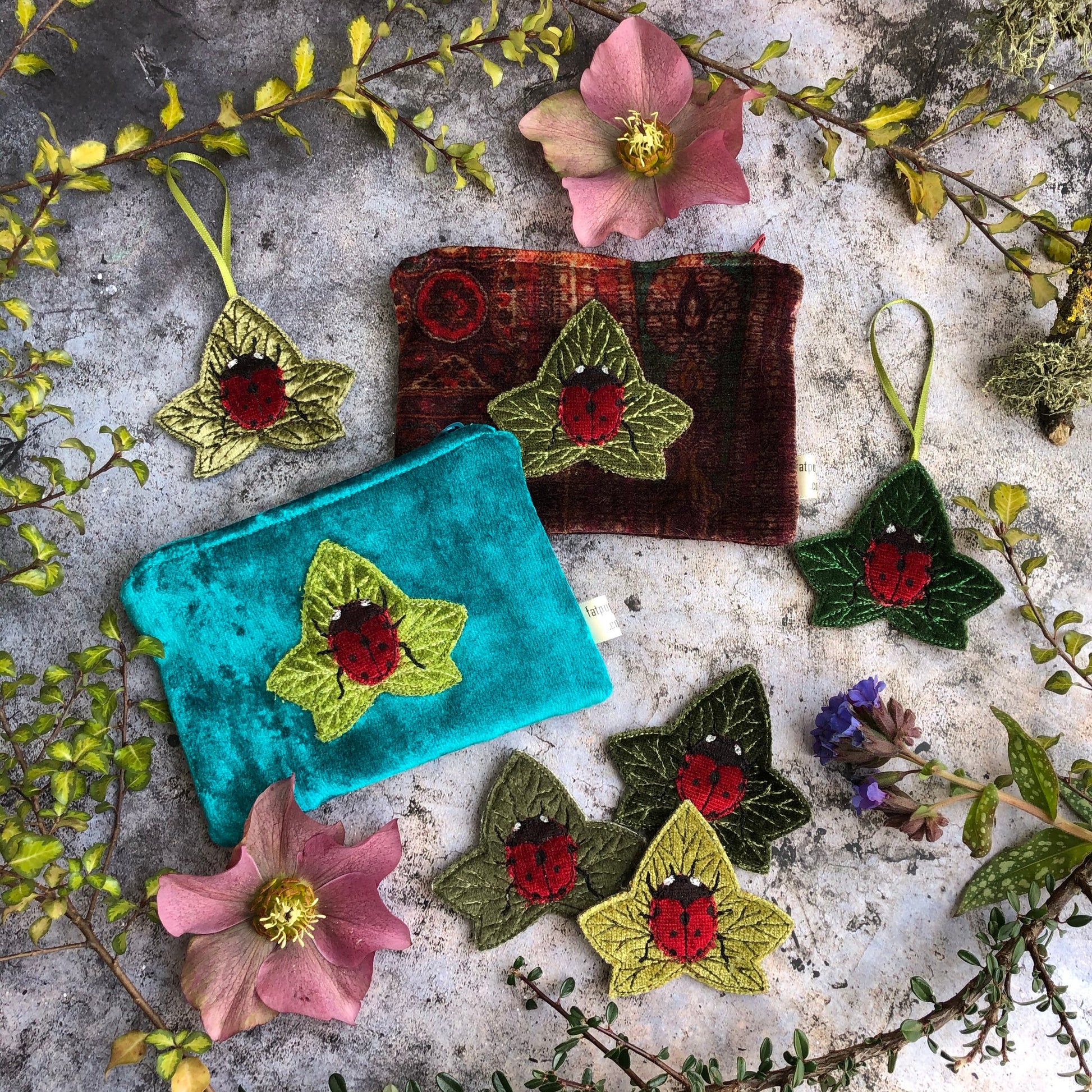 Each one is embellished with a fabric ladybird on a leaf, again all from fabric that was going to be thrown away. They are embellished with free motion embroidery and acrylic paint.
