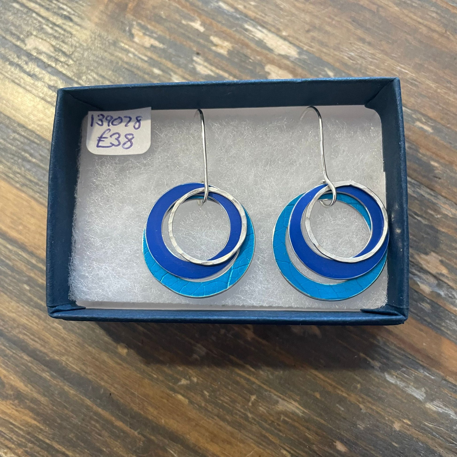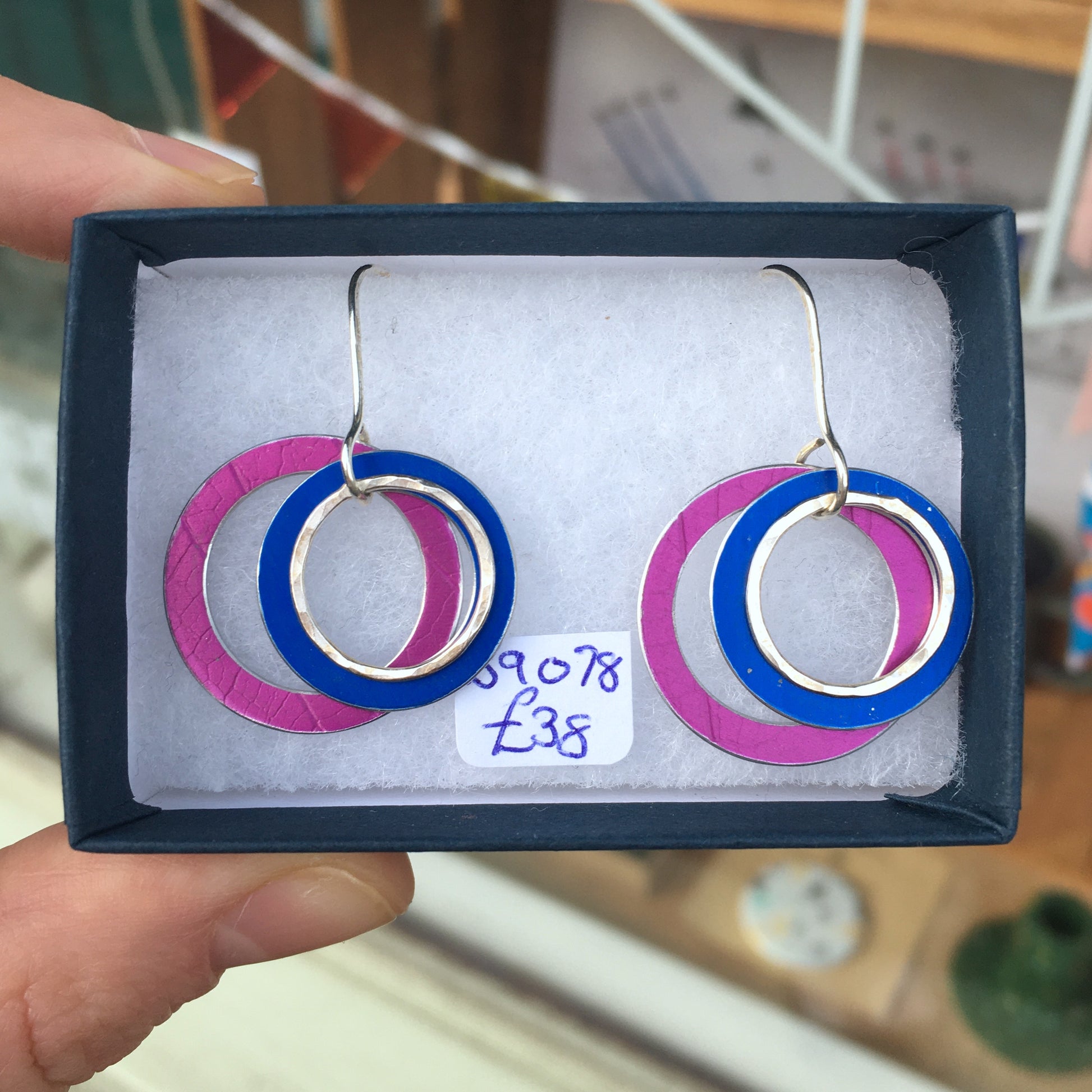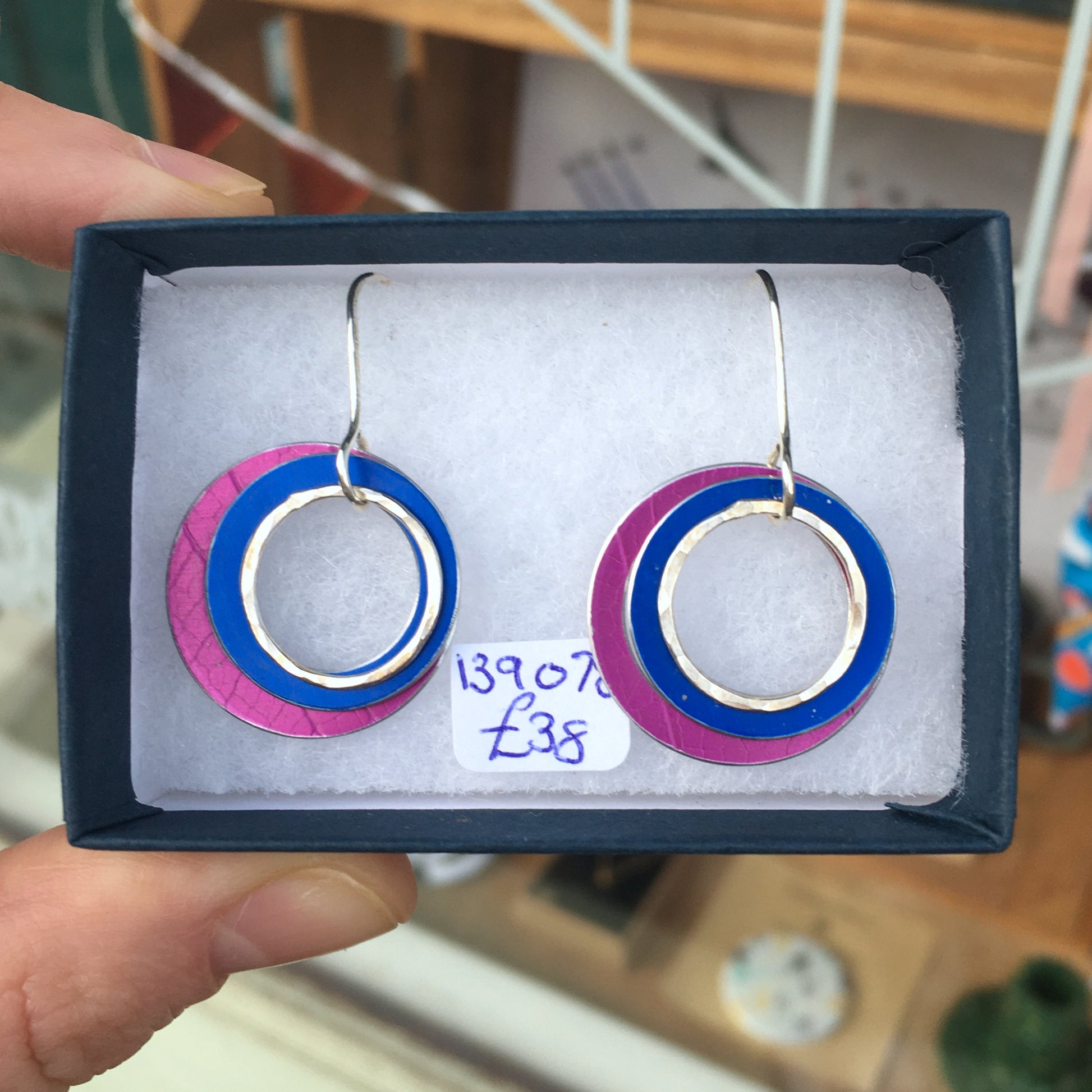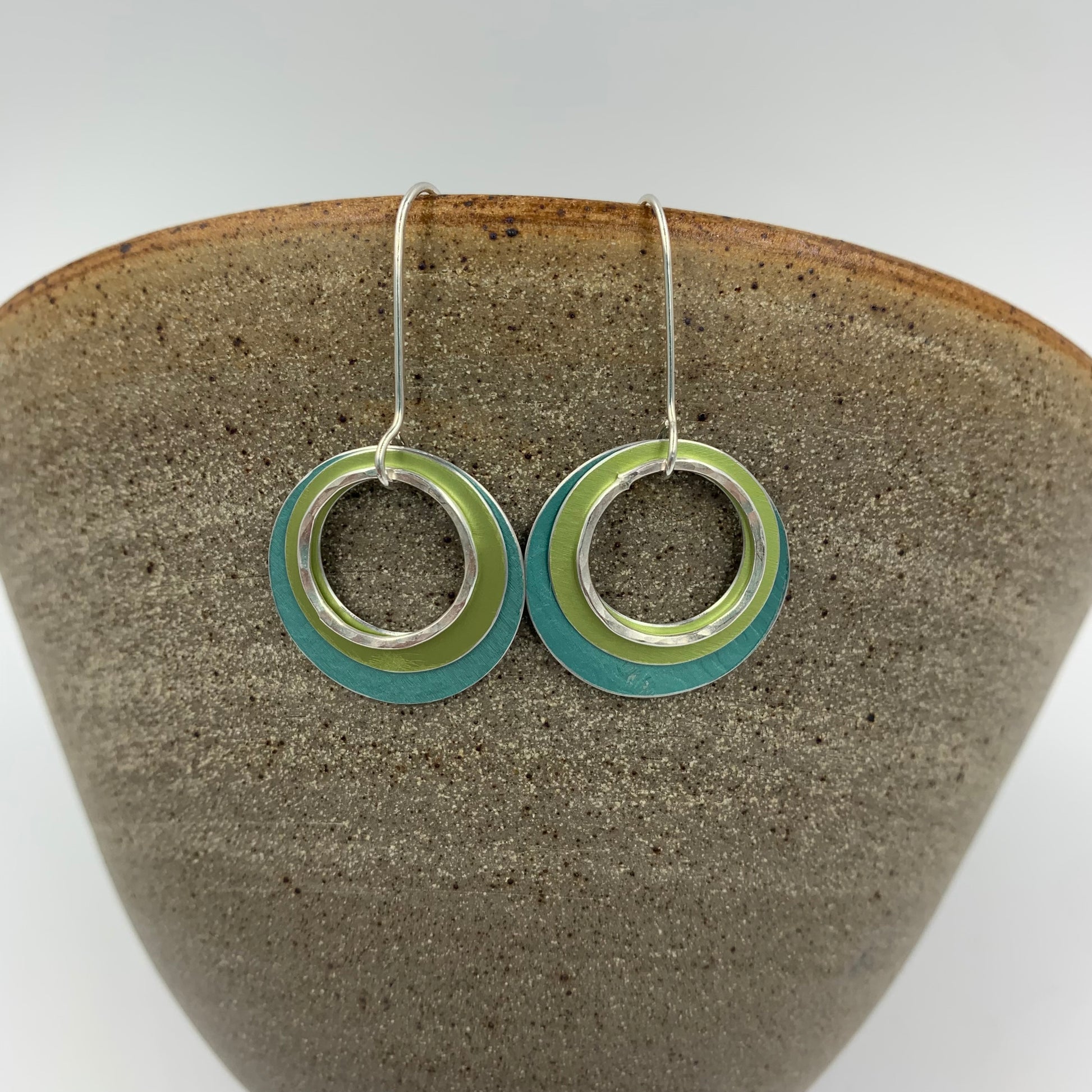 Inspired by watching raindrops fall into a Norwegian fjord, these lightweight colourful earrings are made from hand dyed and textured anodised aluminium discs. A hammered recycled sterling silver ring hangs at the front.