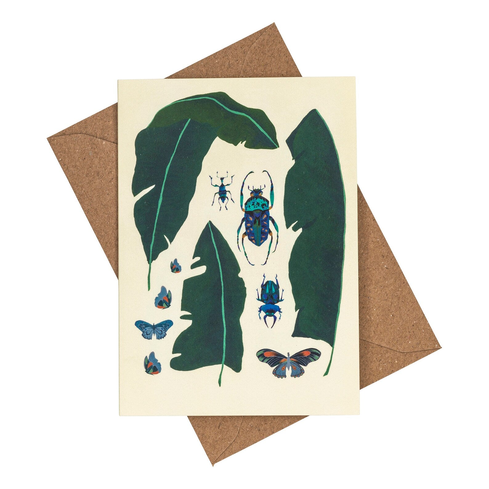 Beautiful A6 blank greeting card of a hand painted Banana Leaves and Insects. This is part of the tropical collection and the prints have been designed to be collected as sets and these cards can be framed so this card can be displayed alone or with any or all of the other cards in the collection.