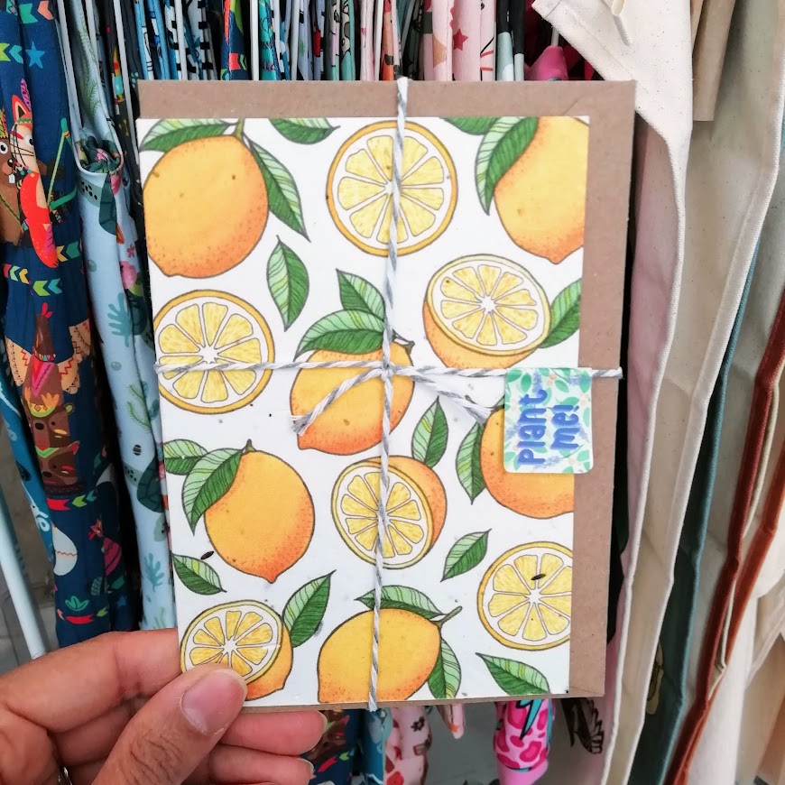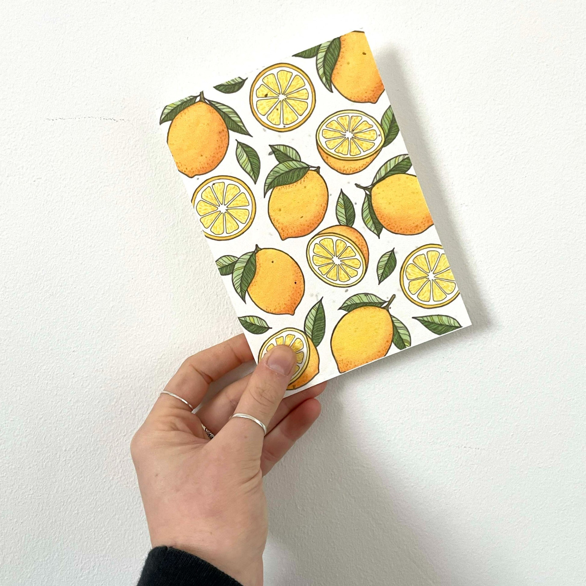 These cards are made from handmade seed paper, featuring a high quality digital print of my original lino cut lemon pattern design.