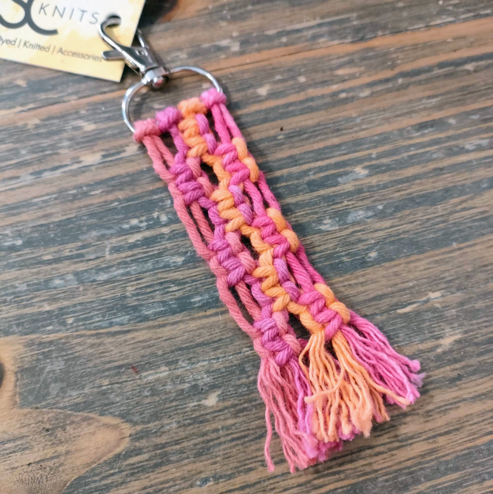 Macramé keyrings, in assorted colours with a multi-coloured tassel.