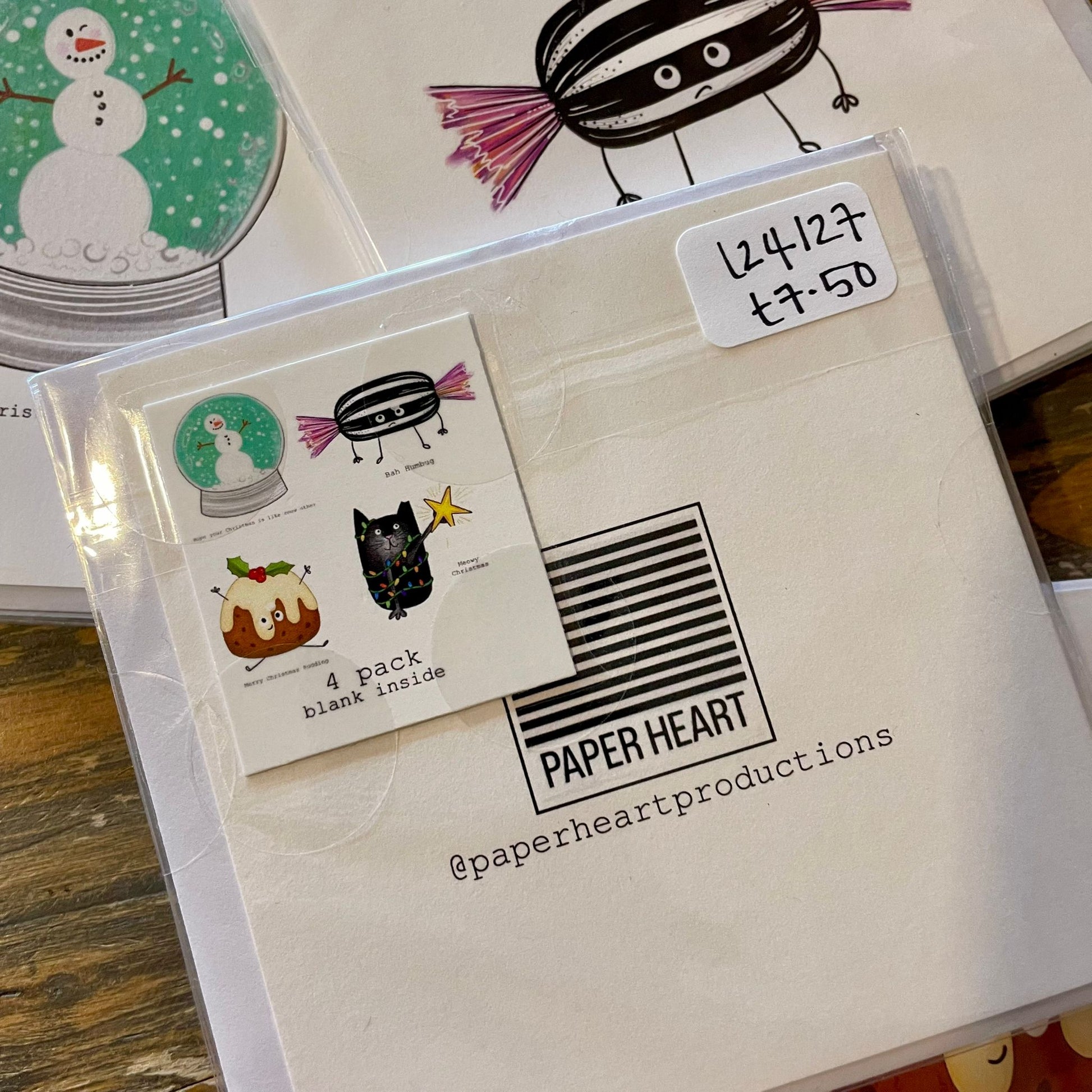 Set of 4 designs - Bah Humbug, Meowy Christmas, Merry Christmas Pudding, Snowglobe.