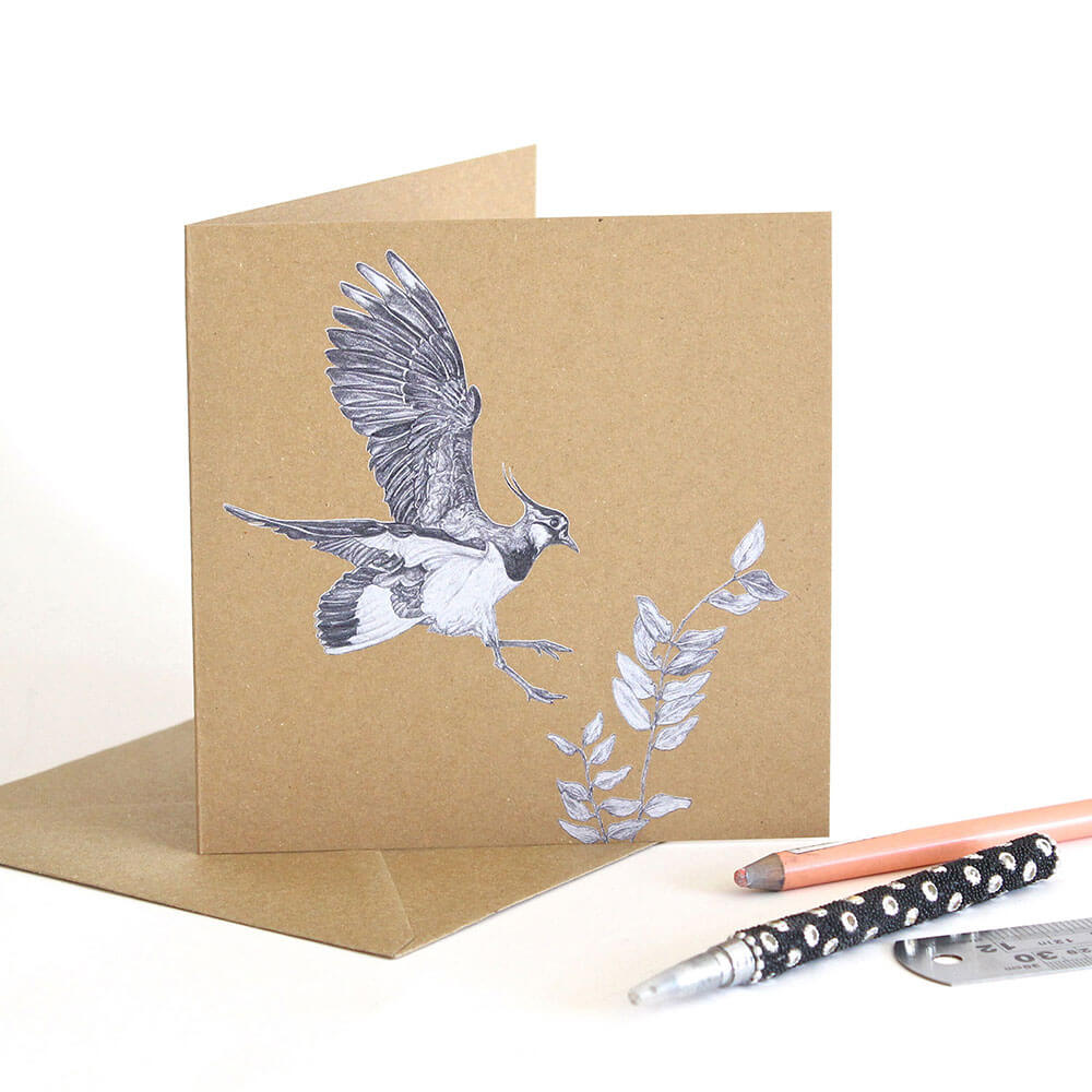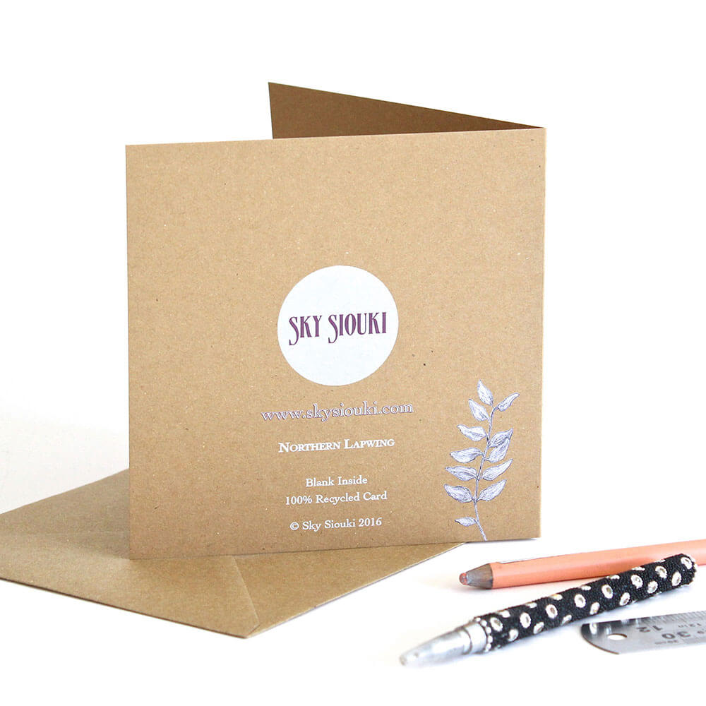 A sprightly little lapwing hops among leafy sprigs on this unique recycled greeting card by Sky Siouki. Blank inside for your own message so this gorgeous art card is suitable to give to a wildlife lover on any occasion.