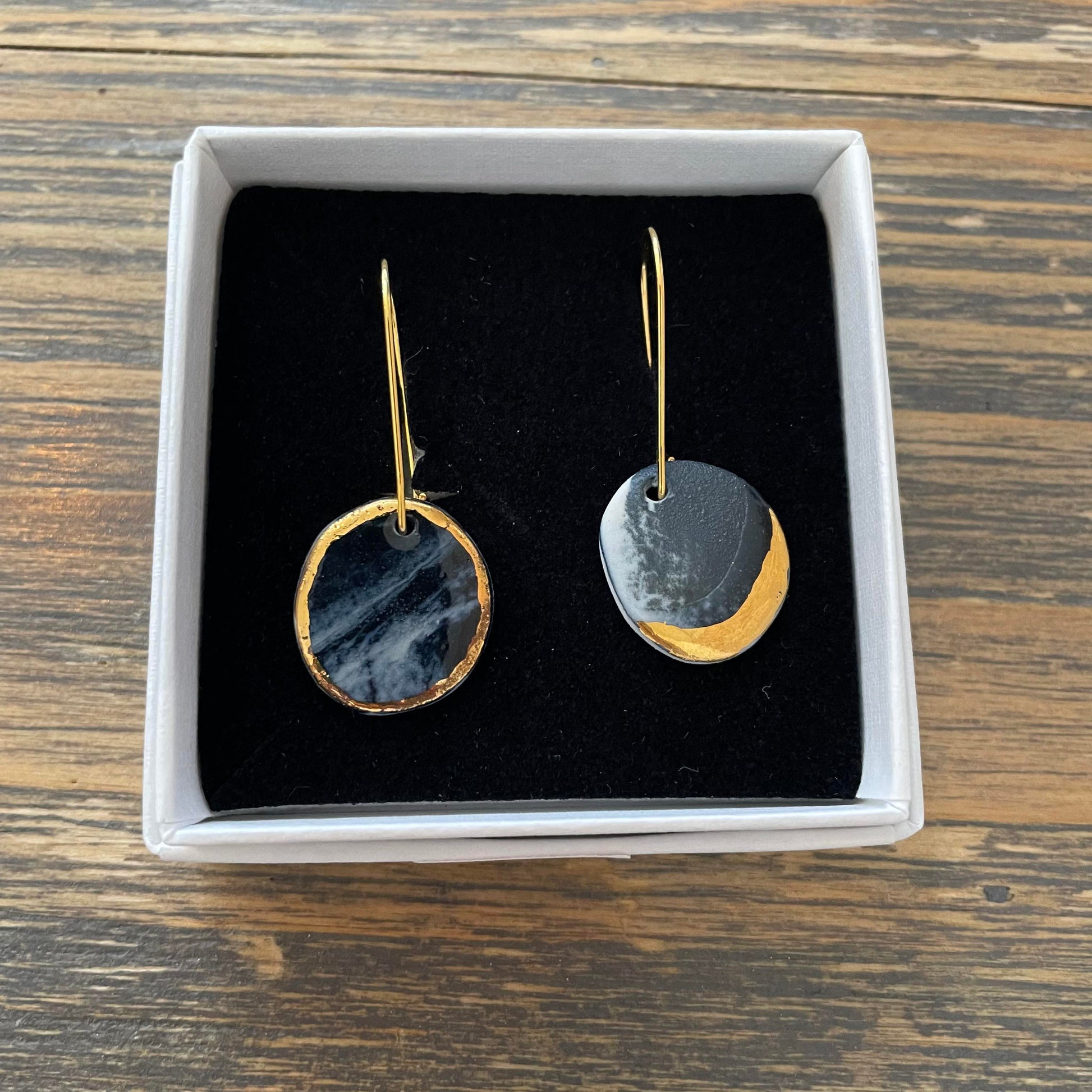 Make a statement with these beautiful porcelain earrings. Crafted with intricate detail, they feature stunning porcelain with golden accents at the tip.