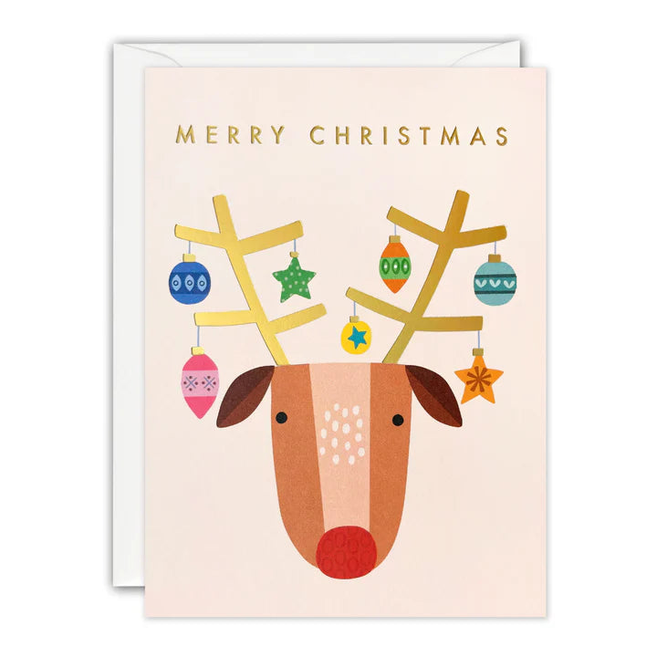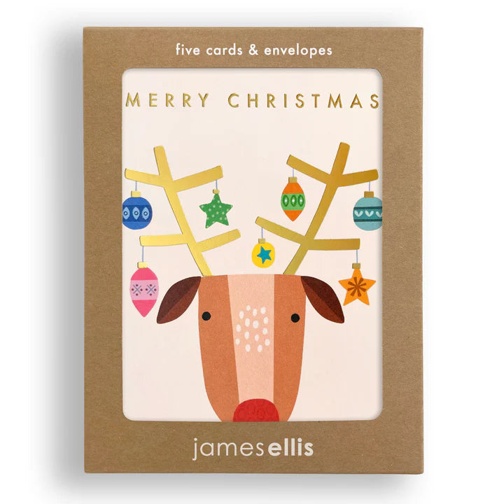 A box of five mini Christmas cards illustrated by Sally Payne. The image on the front of the cards features a red nosed reindeer with colourful baubles hanging from his antlers. Elements within the design are foiled in gold.